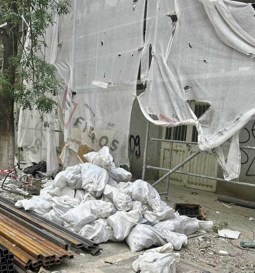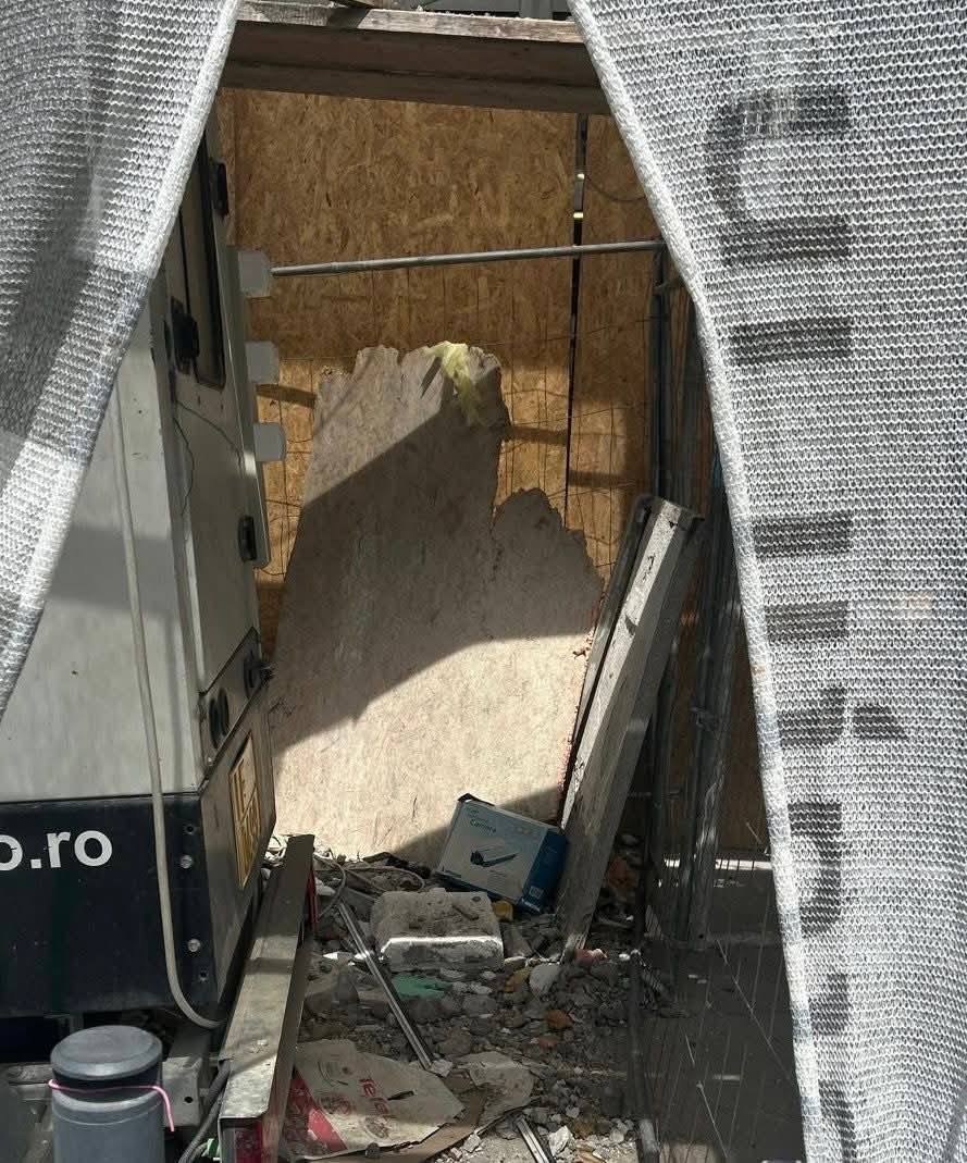 La unul din blocurile aflate în proces de anvelopare, haosul era la el acasă. Saci plini cu resturi din construcții, saci cu deșeuri menajere, alte resturi specifice lucrului pe șantier, toate erau aruncate alandala.