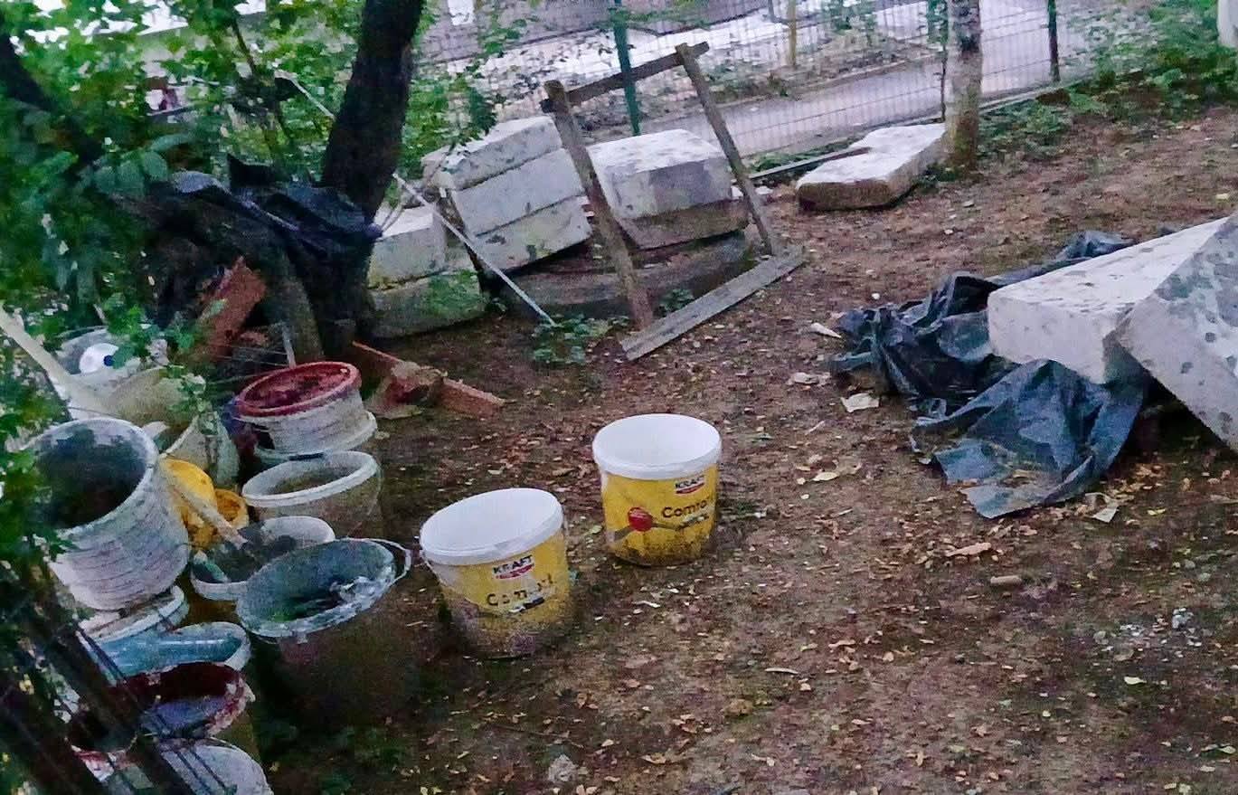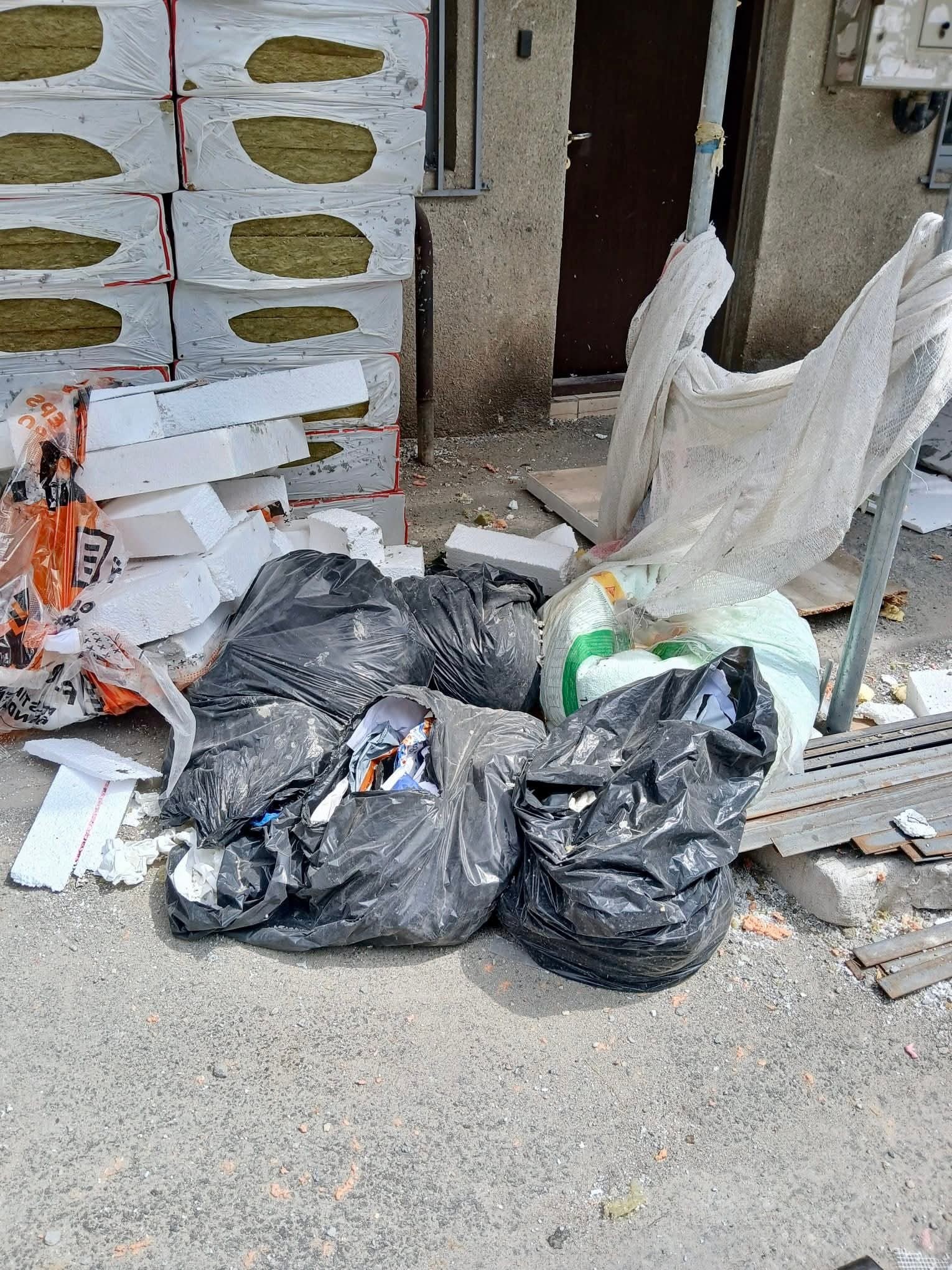 În alte două cazuri, aceeași priveliște dezolantă. Resturi de polistiren, găleţi de lavabilă, saci cu deşeuri din construcții zăceau în grădina blocului, direct pe spaţiul verde.