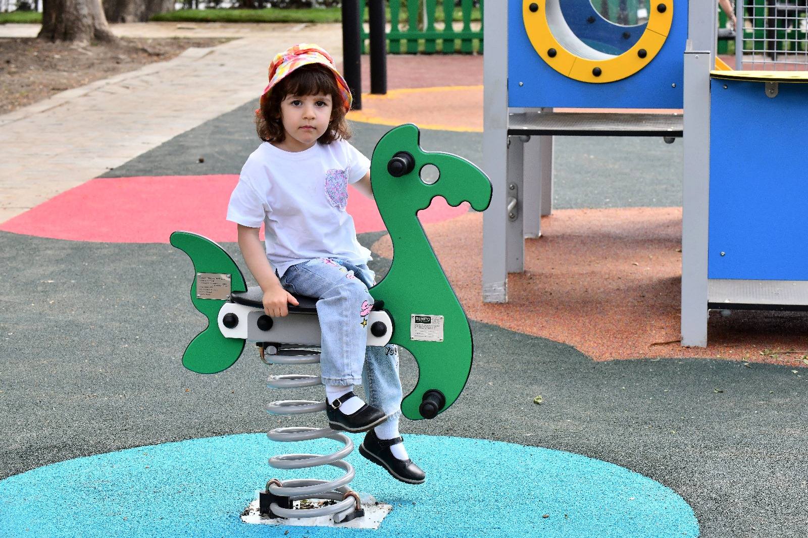 Avem aici leagăne, trambuline, jucării pe arcuri, balansoare, tobogane și ansambluri de joacă.