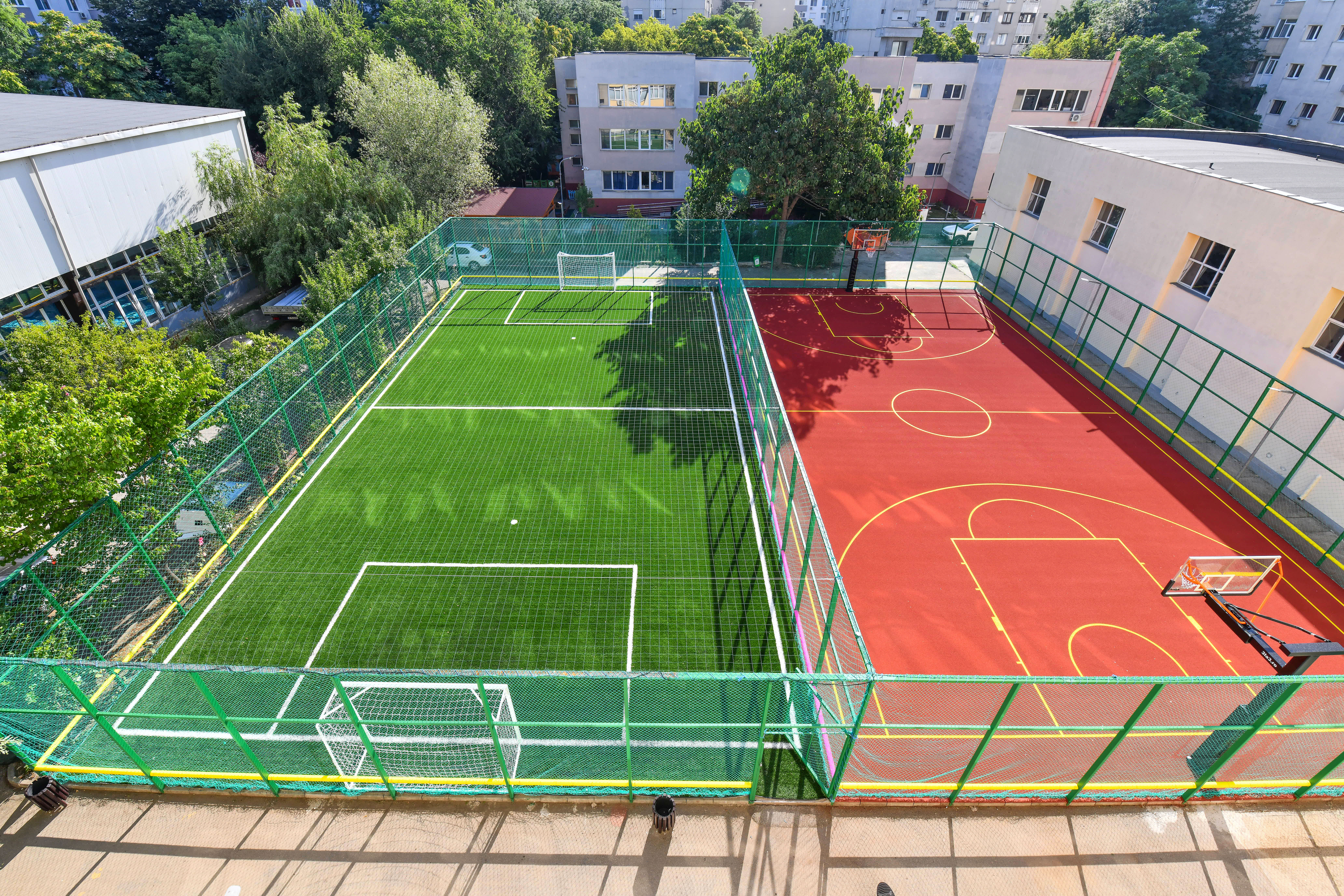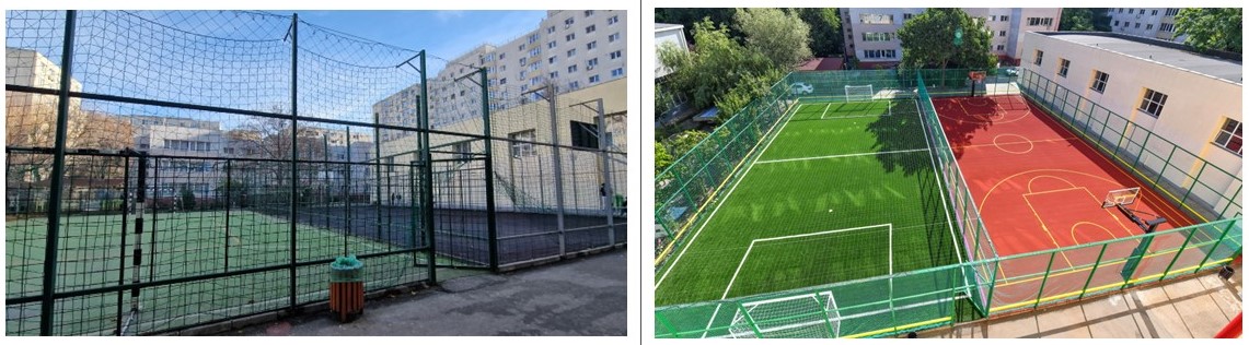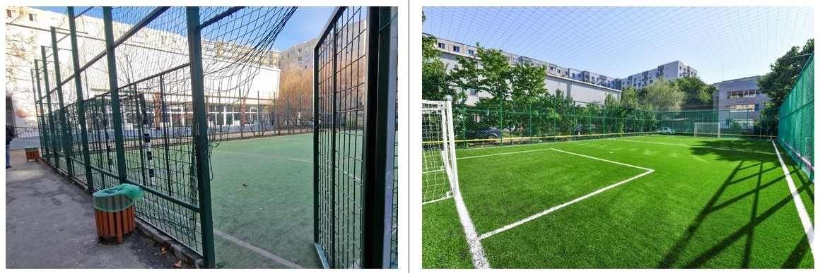 Erau deteriorate, cu tartan rupt, chiar gropi, și gard din sârmă care zdrăngănea la fiecare atingere a mingii. ADPDU Sector 6 a decopertat tot și a pus gazon artificial des și plăcut pe terenul de fotbal, tartan pe cel de baschet, a schimbat gardurile din sârmă cu unele din plasă rezistentă și a camuflat tot ce putea reprezenta un pericol, de jur-împrejur.