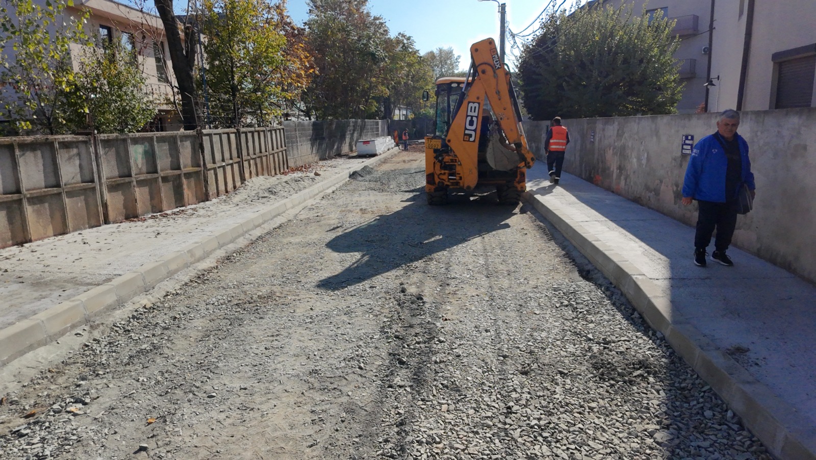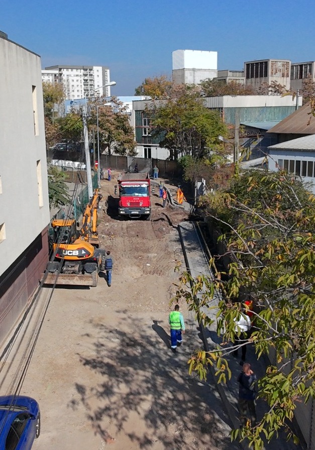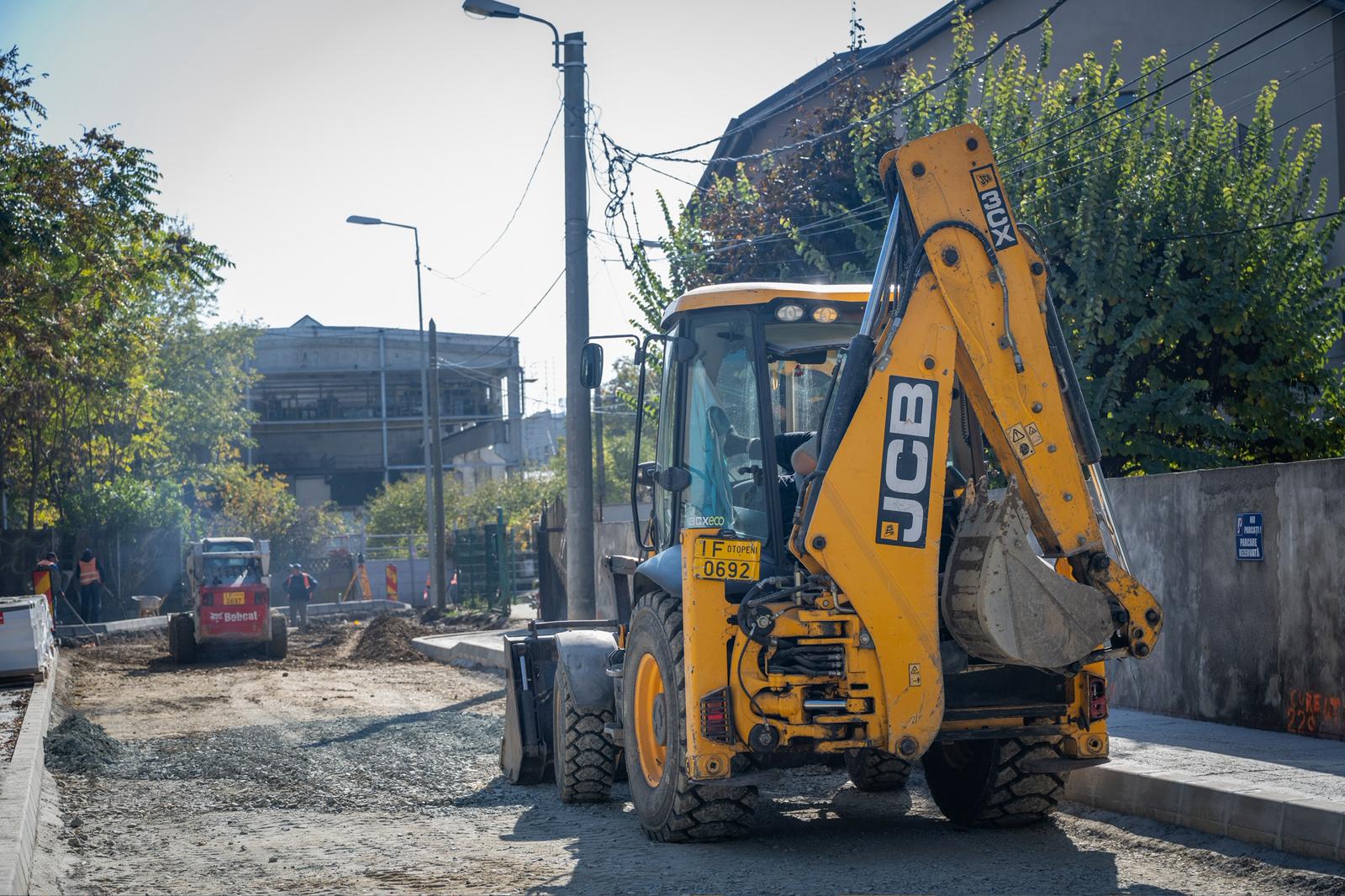 Zeci de muncitori și utilaje se ocupă în prezent de partea carosabilă. Vor amenaja câte o bandă de 2,75 metri pe sens și trotuare de minimum 1,5 metri lățime.