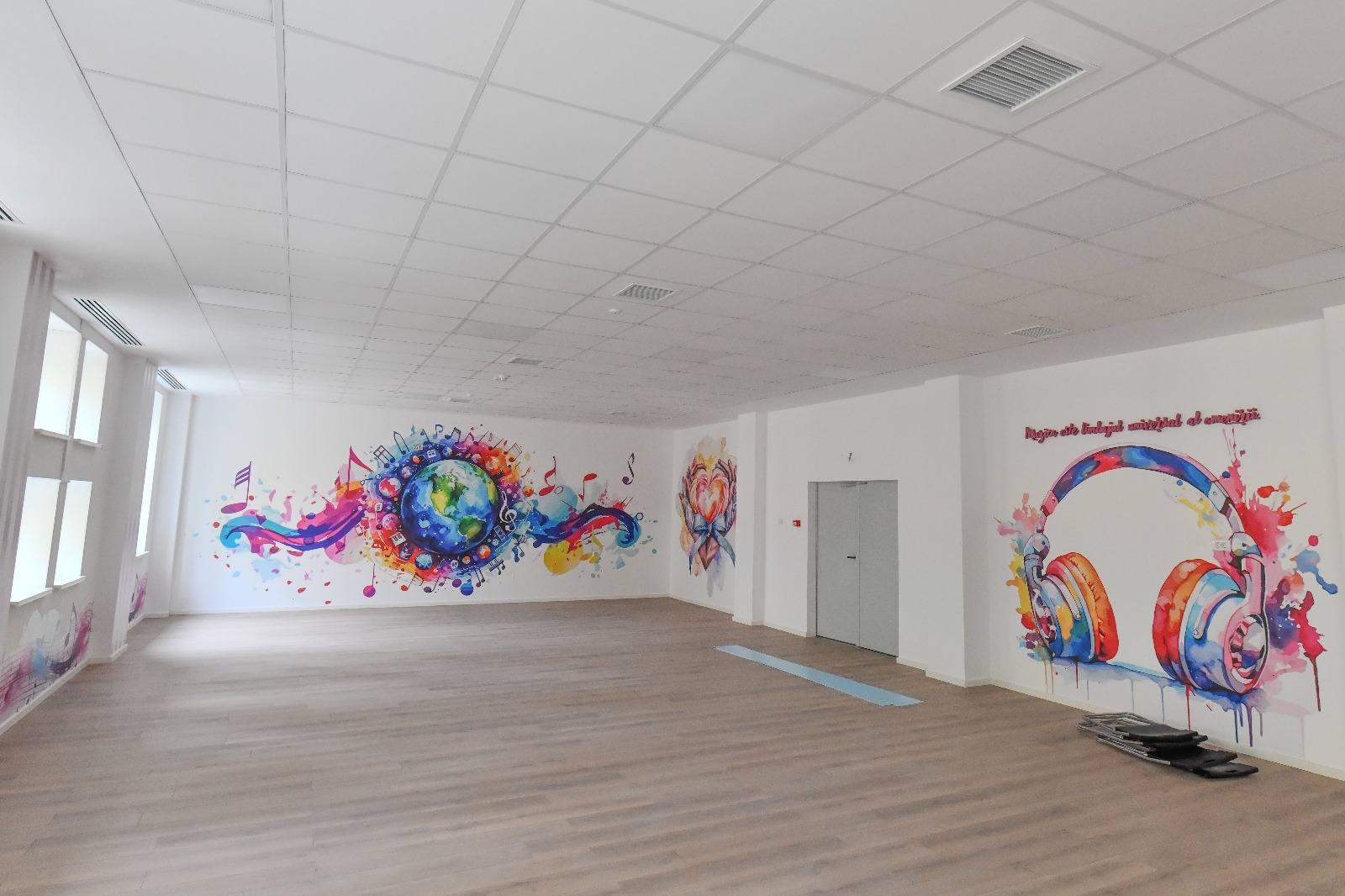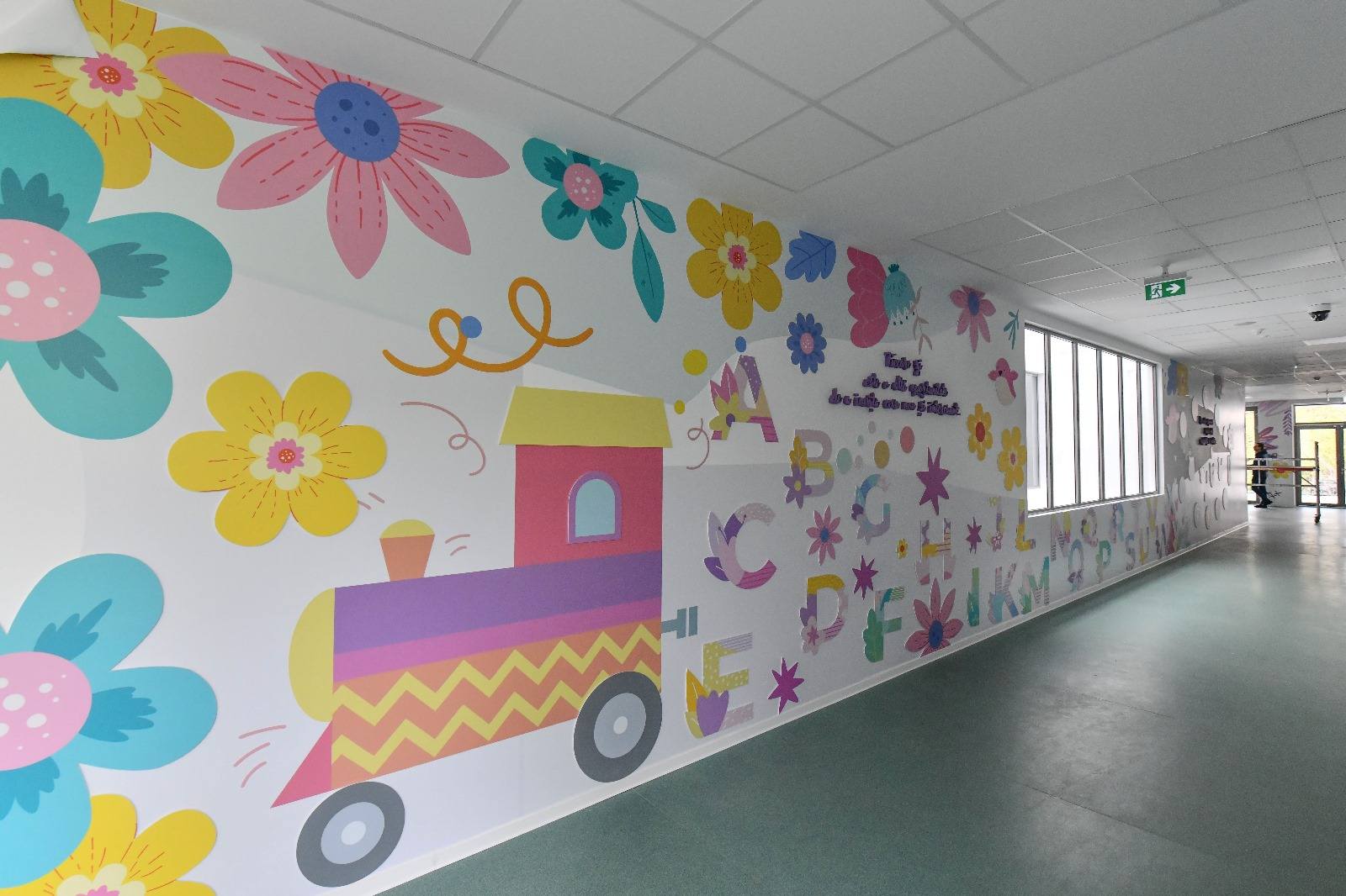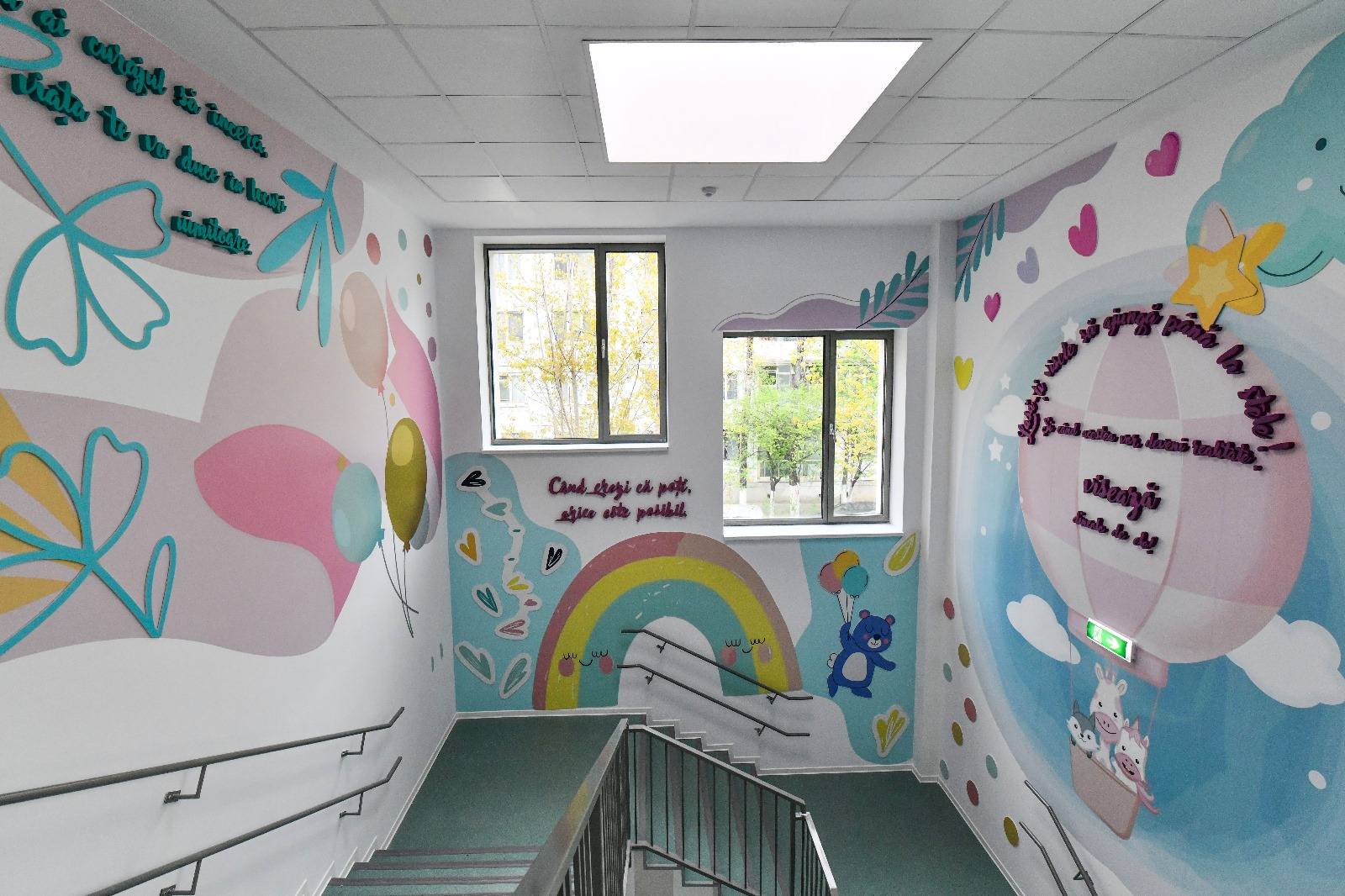 Noua grădiniță din Sectorul 6 arată minunat! Are 6 săli de clasă spațioase, de 132 de metri pătrați, cu băi proprii, ferestre mari și pereți decorați cu picturi vesele și mesaje motivaționale.