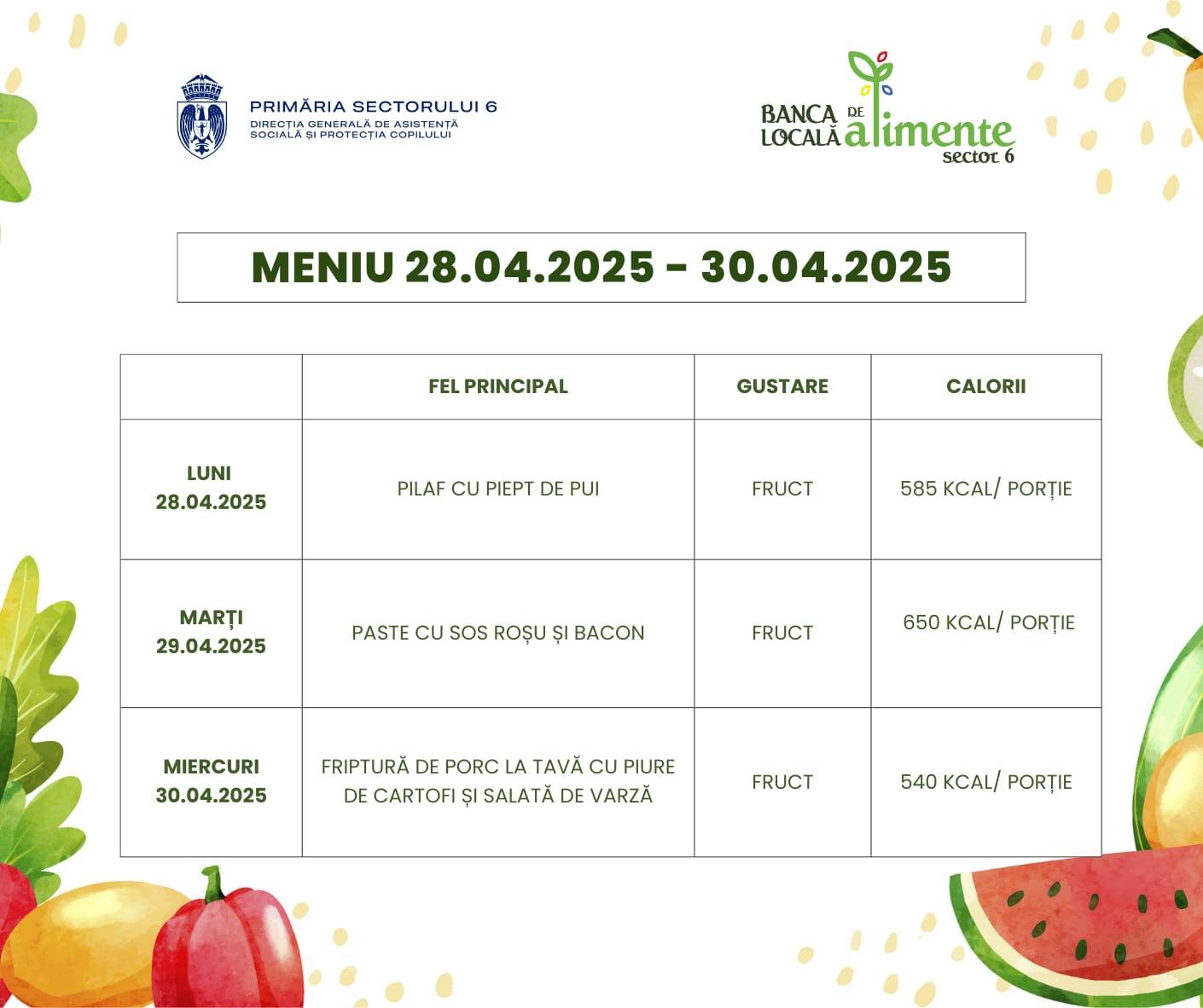 Meniul săptămânii viitoare, la „Școala după școală” După vacanță, revenim în bucătăria Băncii Locale de Alimente Sector 6 cu aceeași energie, bucate bune și grijă pentru micii beneficiari. Va fi o săptămână scurtă, cu doar trei zile în bănci, întrucât 1 și 2 mai sunt zile libere.