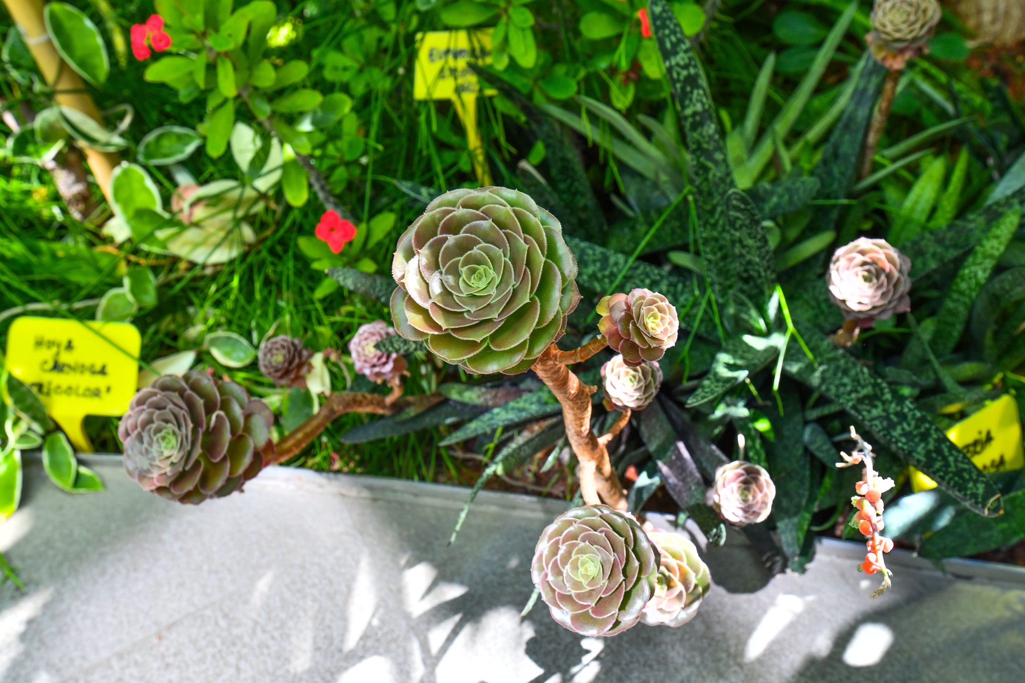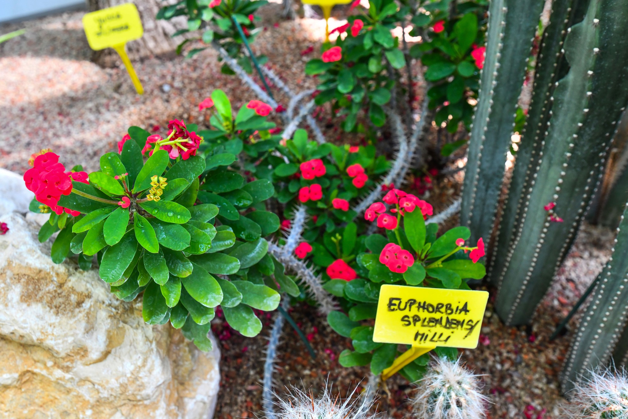 - Pavilionul deșert 2, cu plante suculente: 24-26 de grade. Și aici avem papaya coaptă, flori roșii de „Coroana lui Iisus”, dar și plante rare, cum poate nu ai mai văzut niciodată, cu denumiri care le trădează forma: Șirag de mărgele, Cloșca cu pui, Picioare de elefant.