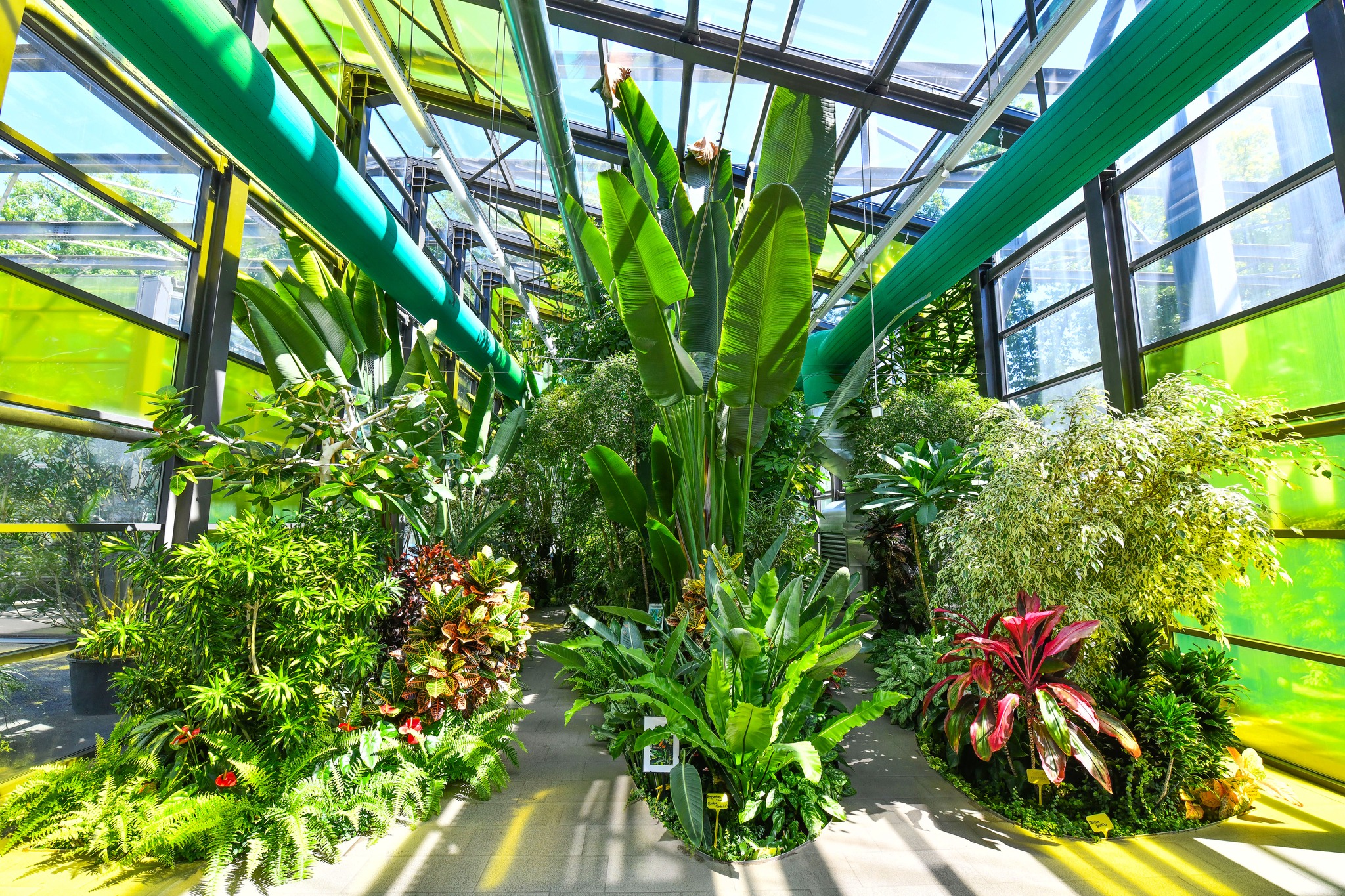 - Pavilionul tropical: 23-25 de grade. Aici crește arborele călătorului, înalt de 10 metri, un ficus cu frunze mari, sub formă de vioară, și multe flori flamingo.