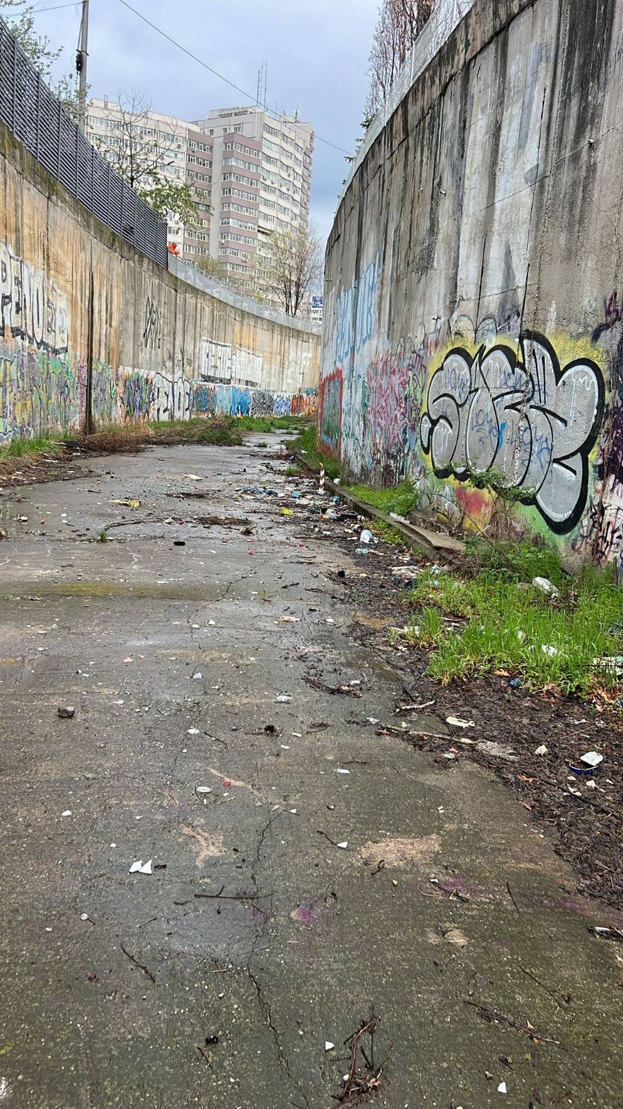 Pungi cu gunoi menajer, PET-uri, mucuri de țigară, haine rupte, resturi de mobilă și chiar cadavre de animale în descompunere – toate acestea formau un peisaj dezolant sub pasarela Virtuții-Fabricii, pe întreaga lungime a liniei de cale ferată dezafectată.