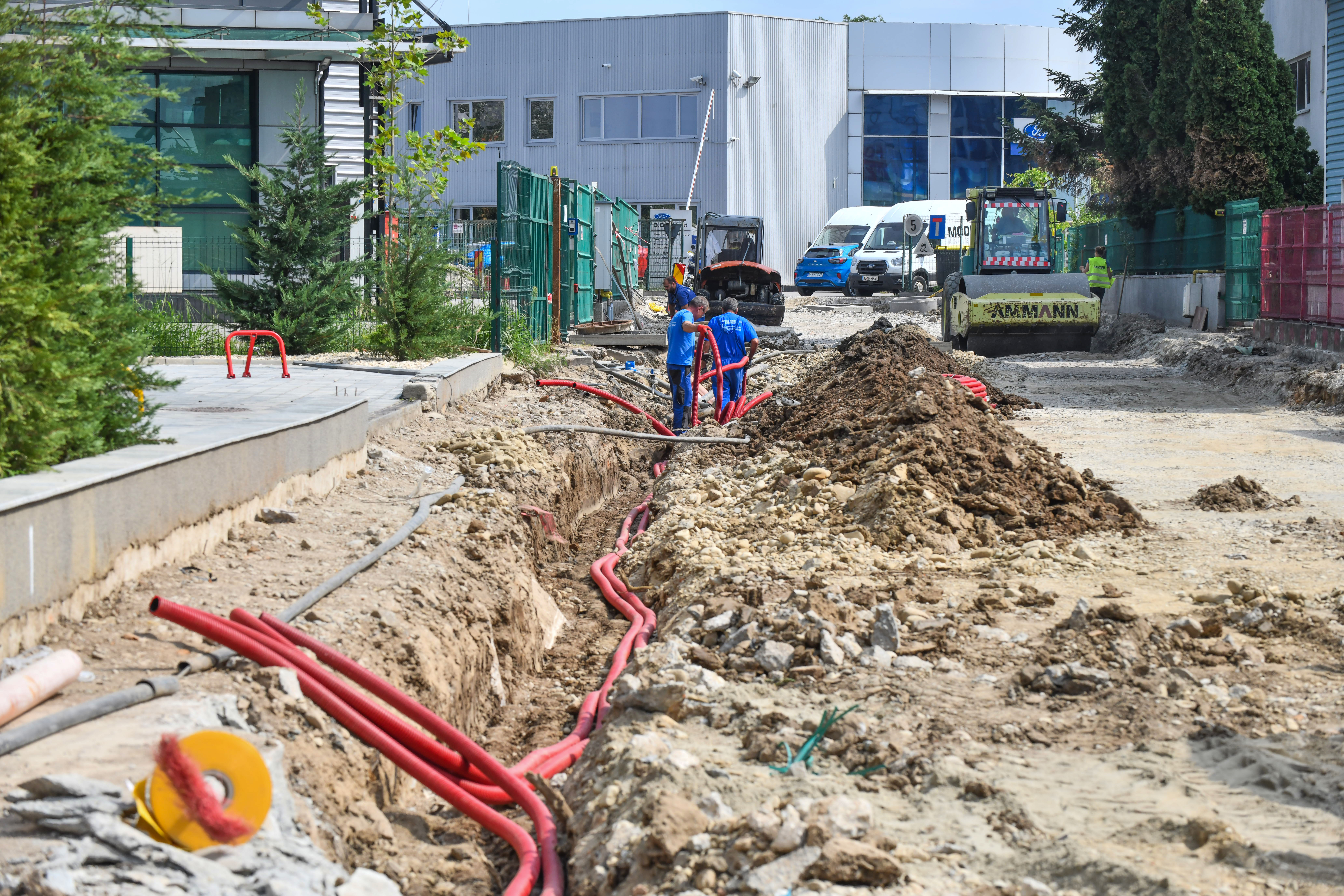 Mai multe utilaje și muncitori făceau azi săpăturile pentru terasament și îngropau rețeaua de iluminat și de Netcity.
