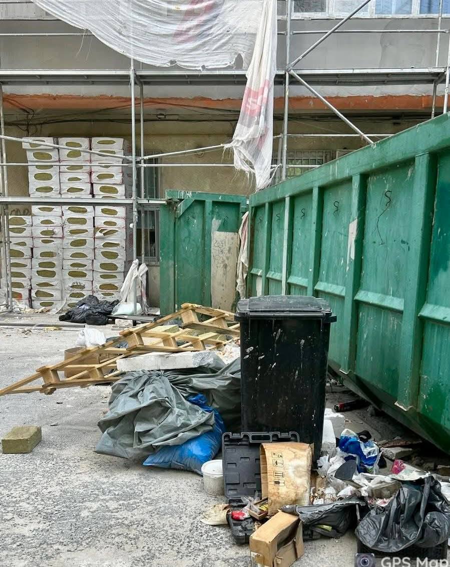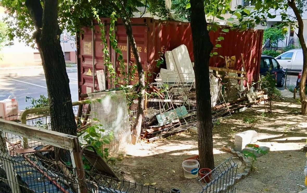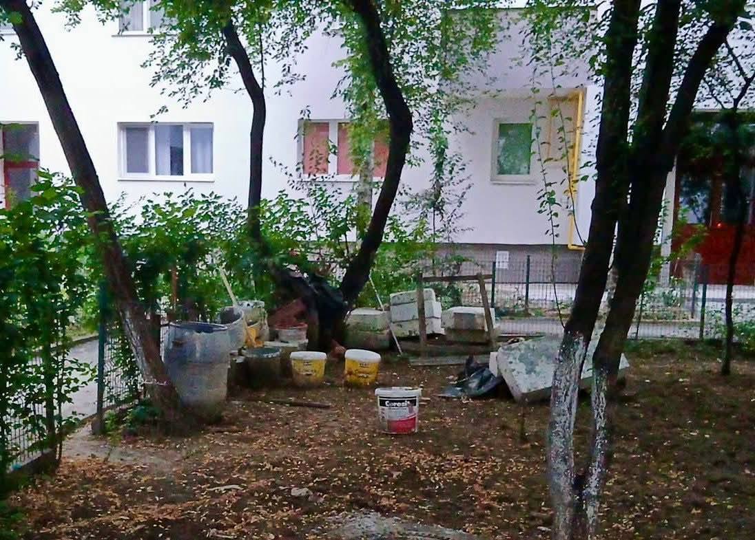În alte două cazuri, aceeași priveliște dezolantă. Resturi de polistiren, găleţi de lavabilă, saci cu deşeuri din construcții zăceau în grădina blocului, direct pe spaţiul verde.
