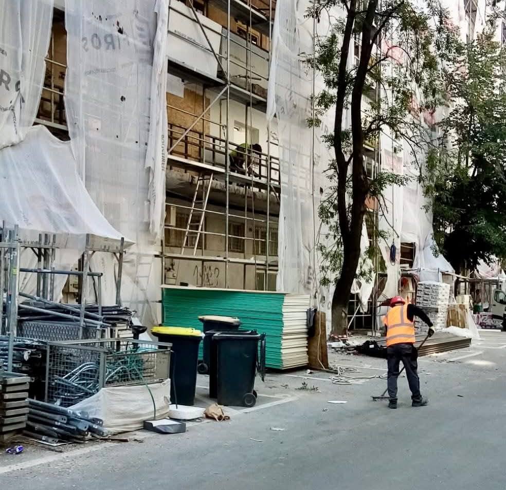 La unul din blocurile aflate în proces de anvelopare, haosul era la el acasă. Saci plini cu resturi din construcții, saci cu deșeuri menajere, alte resturi specifice lucrului pe șantier, toate erau aruncate alandala.