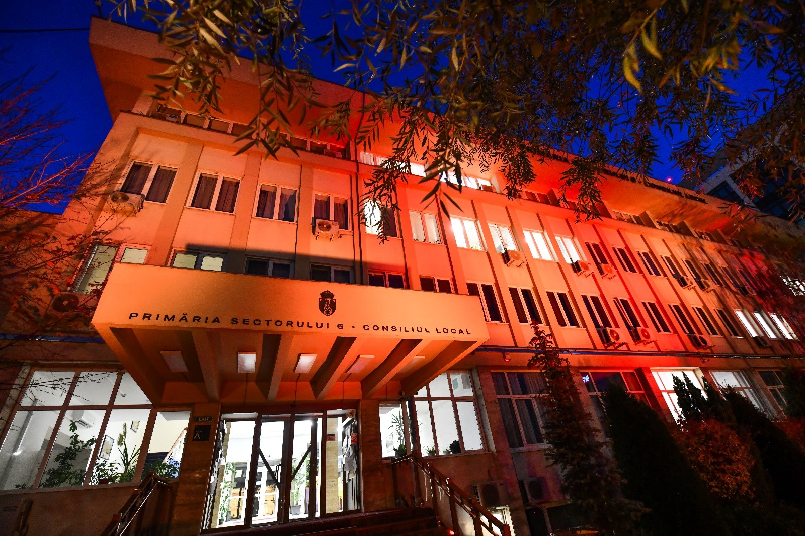 Clădirea Primăriei Sectorului 6, iluminată în portocaliu, de Ziua Internaţională pentru Eliminarea Violenţei împotriva Femeilor