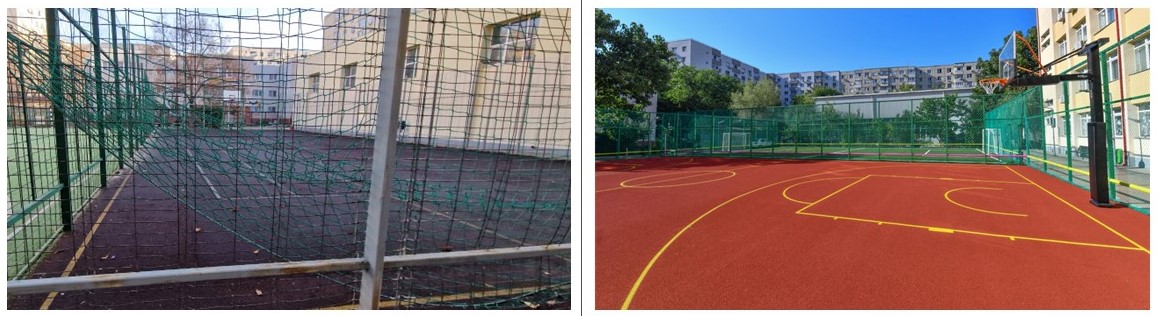 Erau deteriorate, cu tartan rupt, chiar gropi, și gard din sârmă care zdrăngănea la fiecare atingere a mingii. ADPDU Sector 6 a decopertat tot și a pus gazon artificial des și plăcut pe terenul de fotbal, tartan pe cel de baschet, a schimbat gardurile din sârmă cu unele din plasă rezistentă și a camuflat tot ce putea reprezenta un pericol, de jur-împrejur.