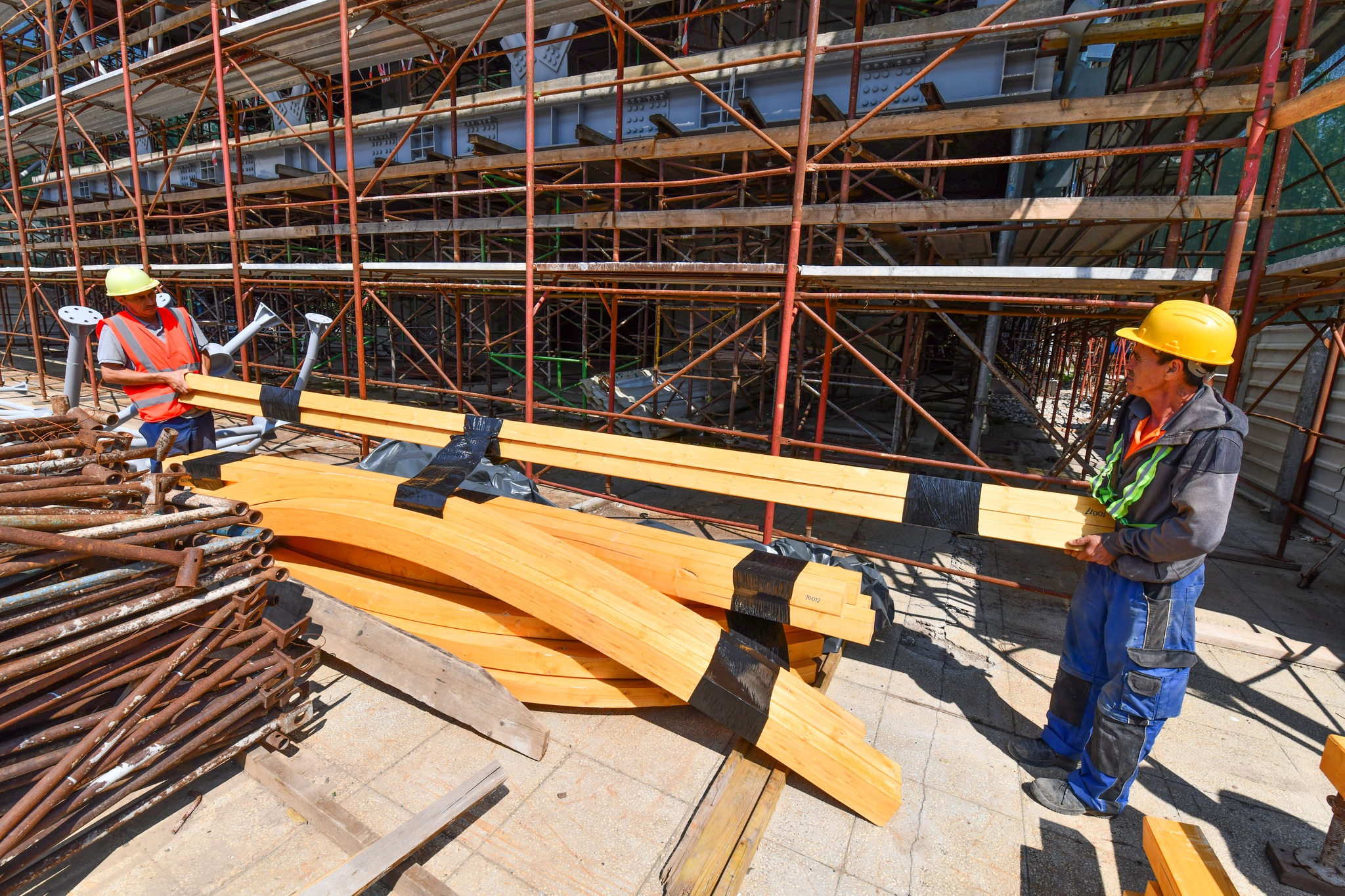 - De luni, 4 august, a început montarea arcelor de lemn stratificat.