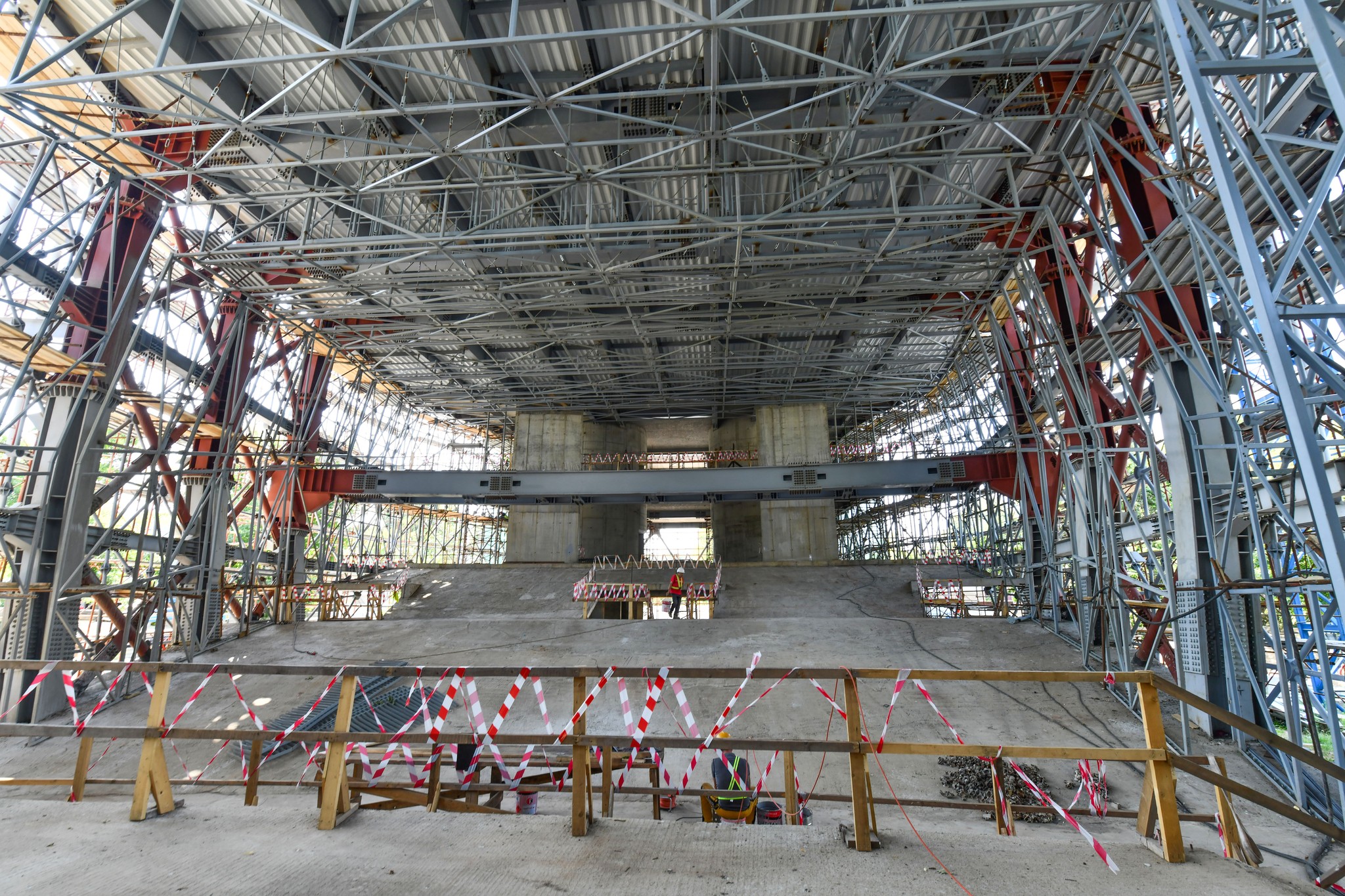 - A fost aproape complet acoperit de uriașa „pânză” de metal, ce servește drept structură.