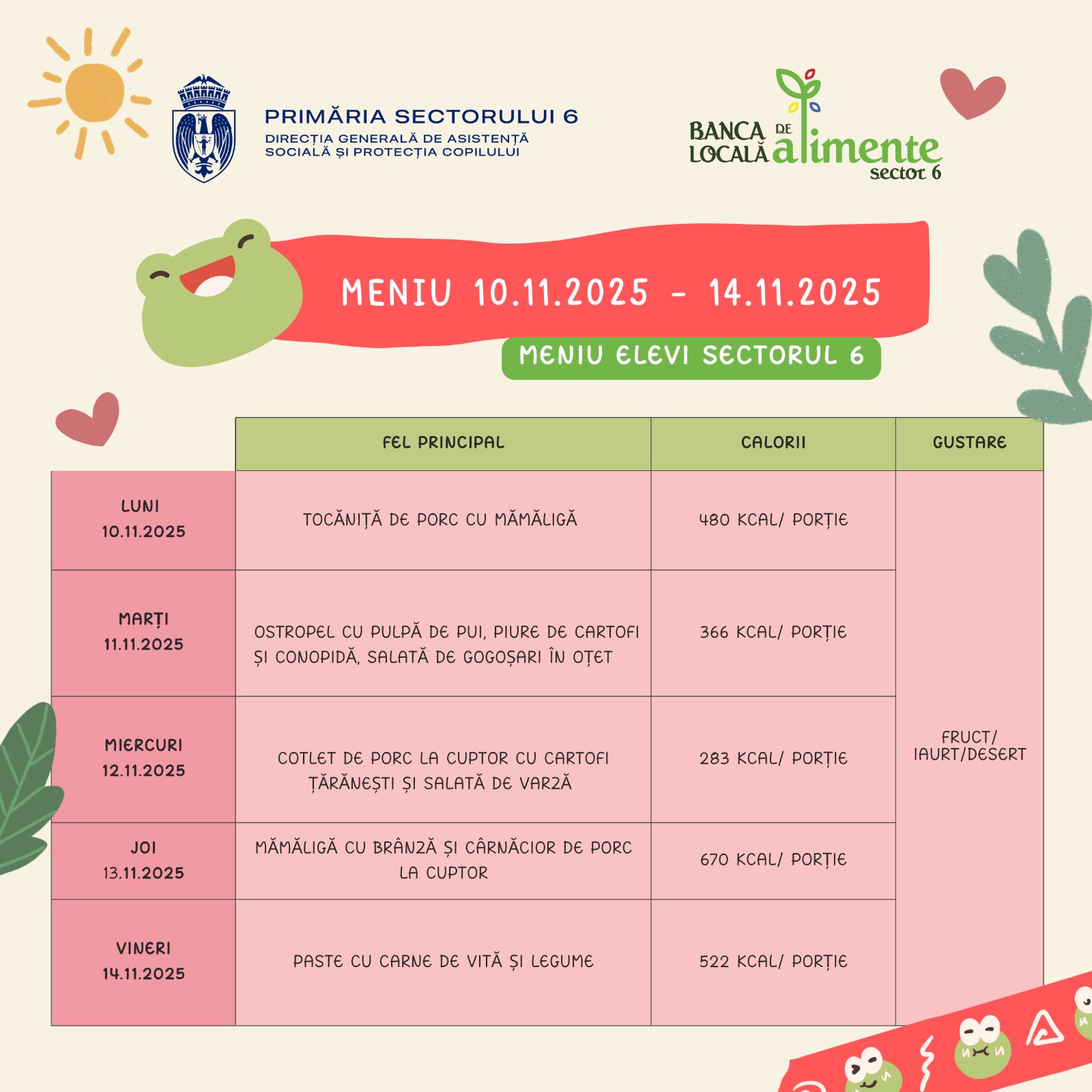 Mâncare gustoasă, sănătoasă și echilibrată! Meniul săptămânii 10 - 14 noiembrie, în școlile din Sectorul 6