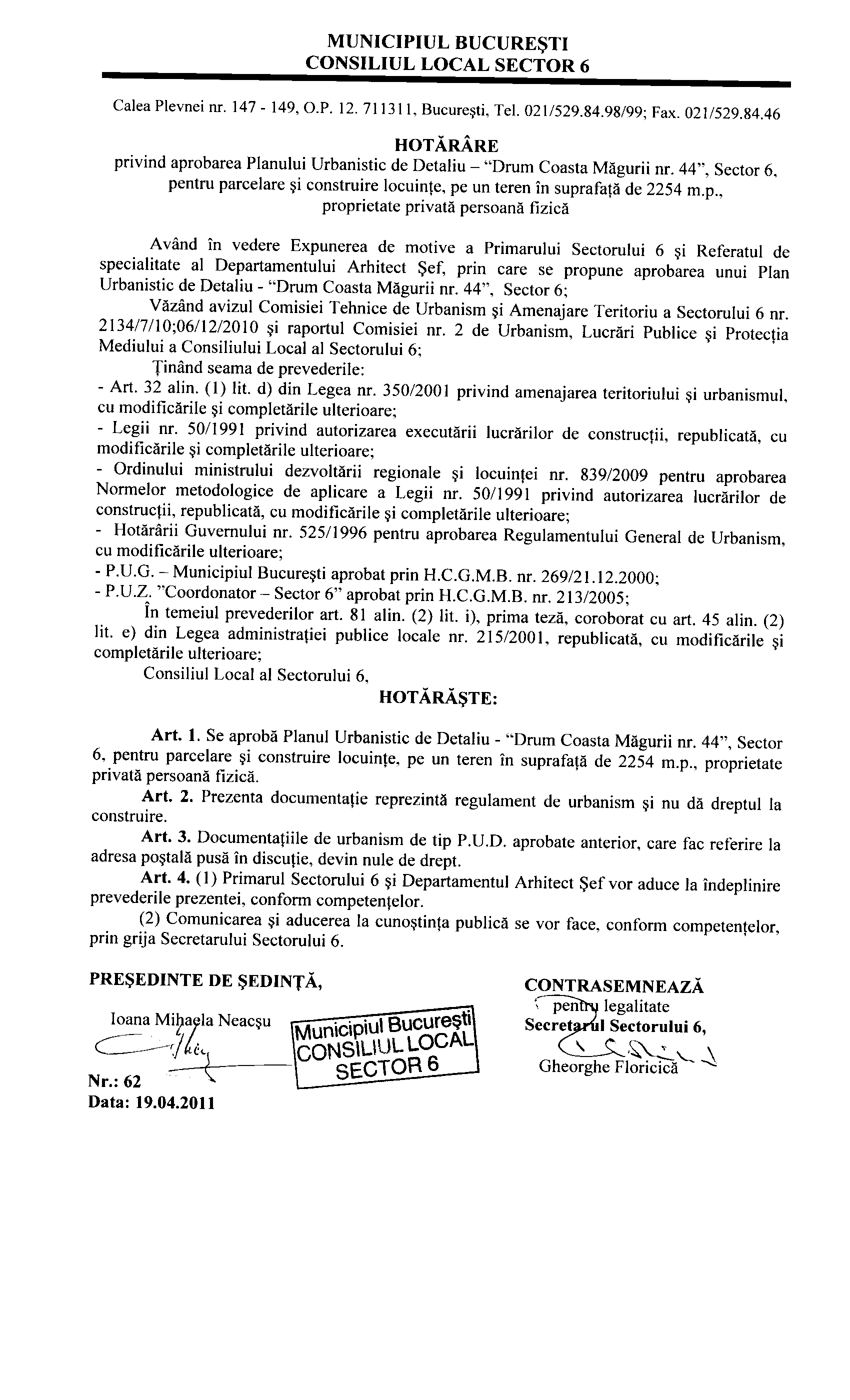 Hotărâre privind aprobarea Planului Urbanistic de Detaliu (PUD) – "Drum Coasta Măgurii nr.44", Sector 6, pentru parcelare şi construire locuinţe, pe un teren în suprafaţă de 2254 m.p., proprietate privată persoană fizică