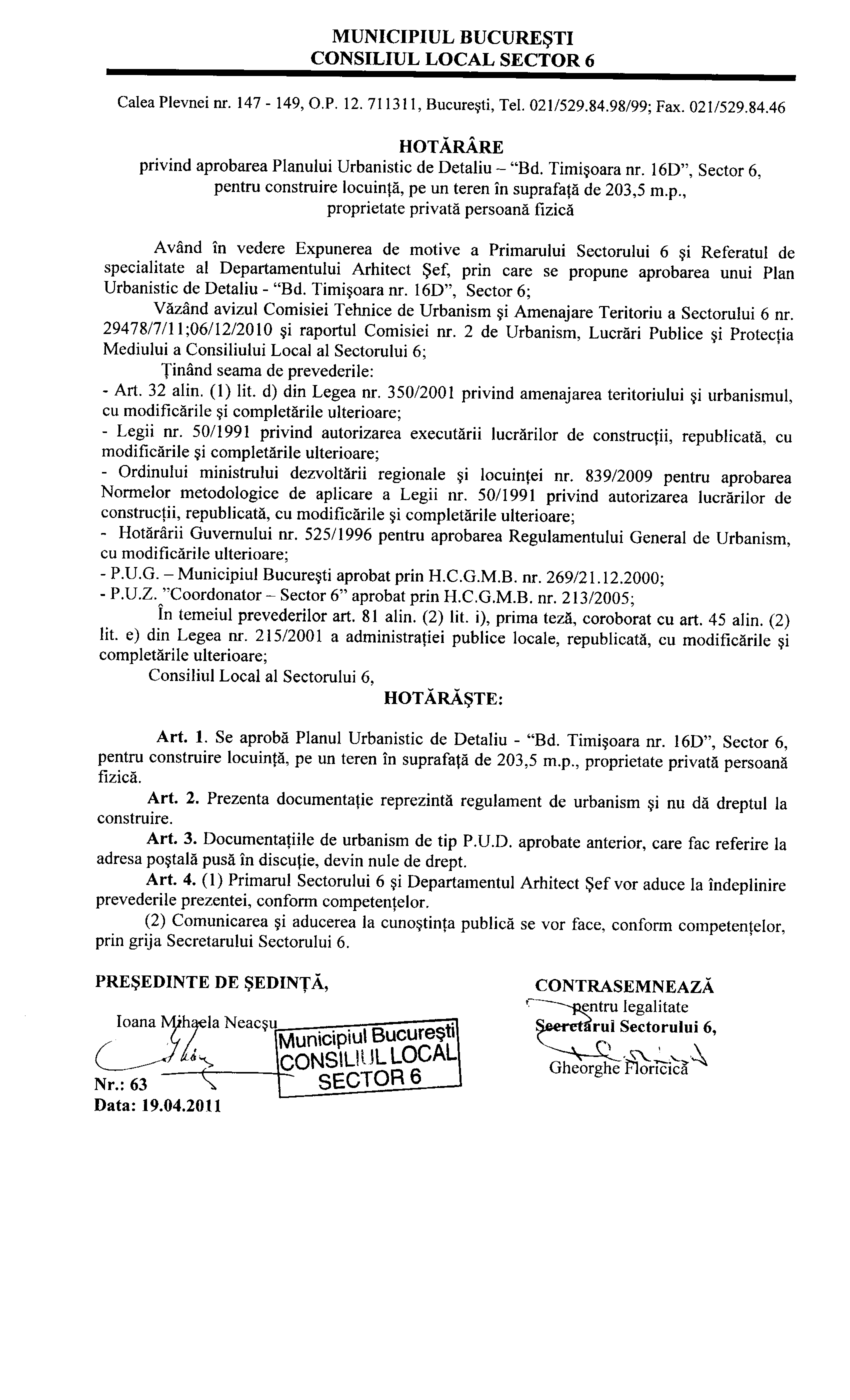 Hotărâre privind aprobarea Planului Urbanistic de Detaliu (PUD) – "Bd. Timişoara nr.16D", Sector 6, pentru construire locuinţă, pe un teren în suprafaţă de 203,5 m.p., proprietate privată persoană fizică