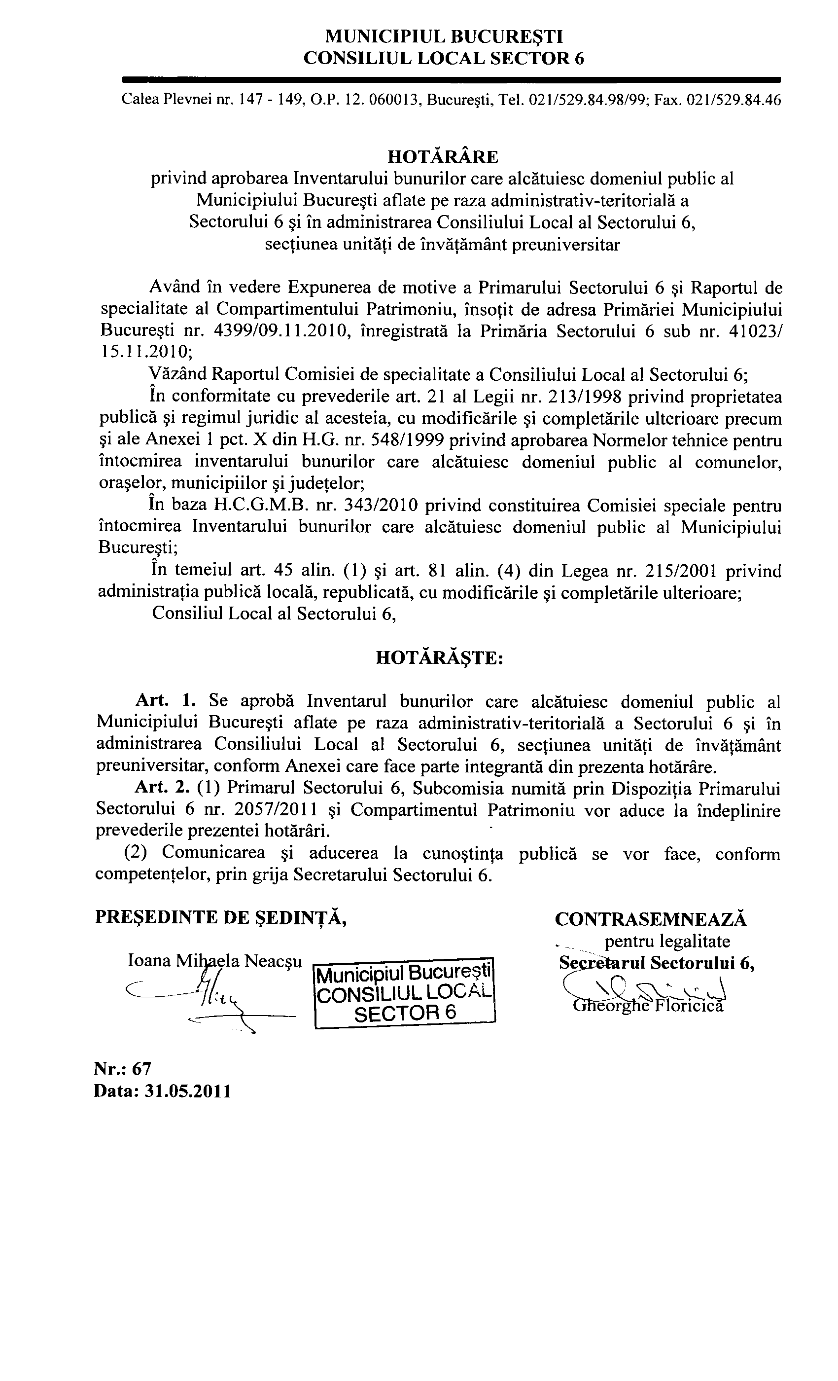 Hotărâre privind aprobarea Inventarului bunurilor care alcătuiesc domeniul public al Municipiului Bucureşti aflate pe raza administrativ-teritorială a Sectorului 6 şi în administrarea Consiliului Local al Sectorului 6, secţiunea unităţi de învăţământ preuniversitar