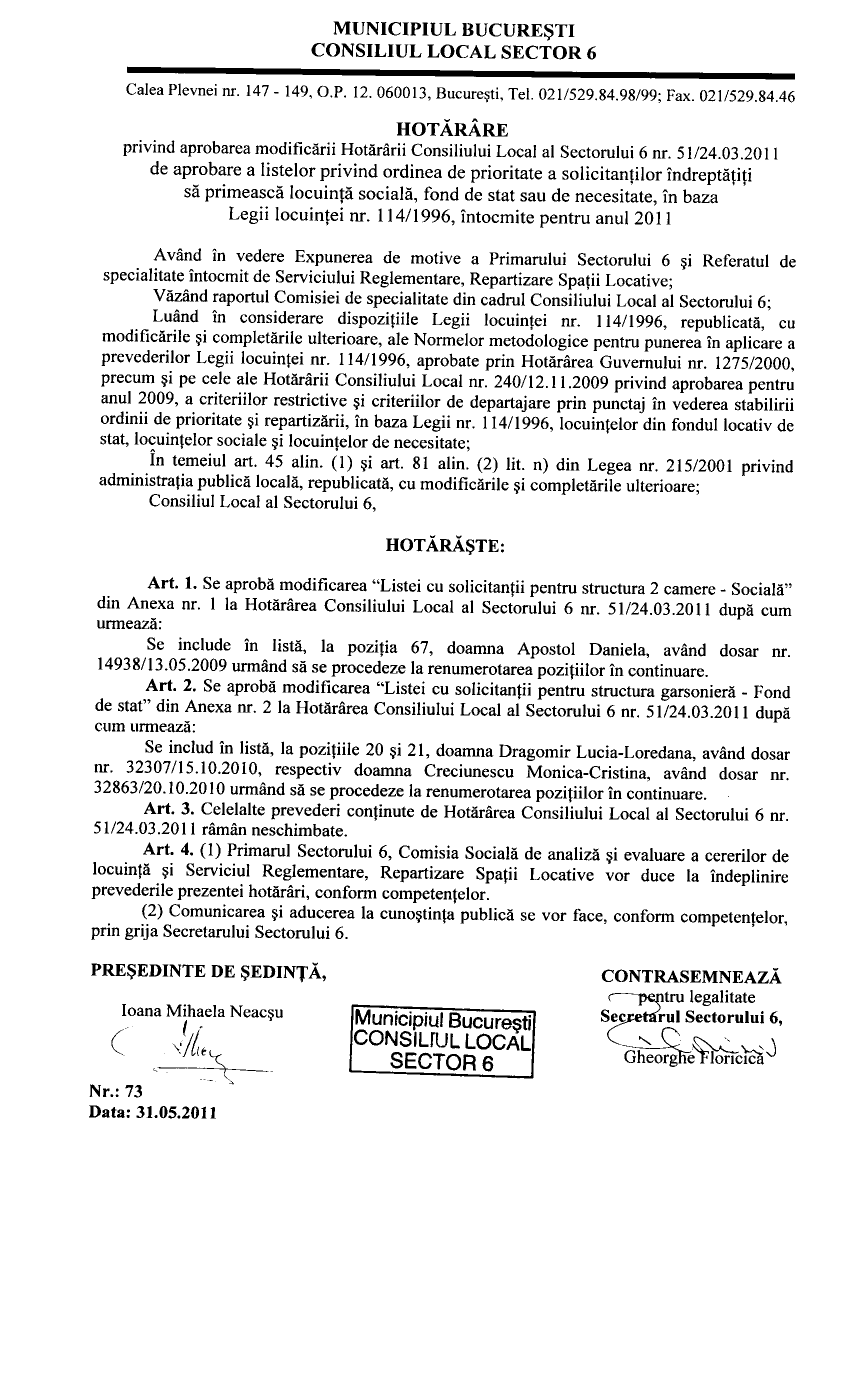 Hotărâre privind aprobarea modificării Hotărârii Consiliului Local al Sectorului 6 nr.51/ 24.03.2011 de aprobare a listelor privind ordinea de priorietate a solicitanţilor îndreptăţiţi să primească locuinţă socială, fond de stat sau de necessitate, în baza Legii locuinţei nr.114/ 1996, întocmite pentru anul 2011