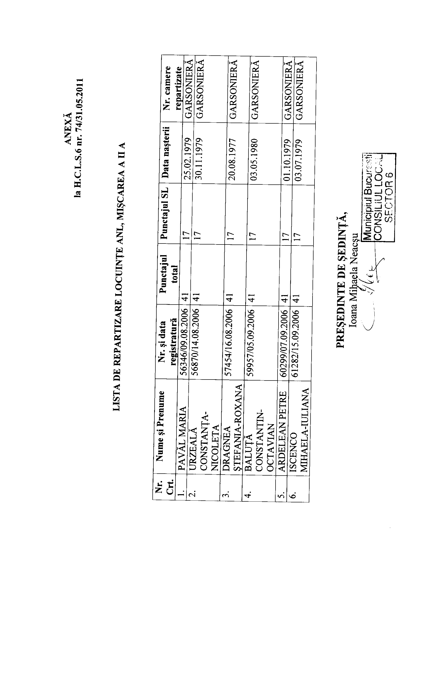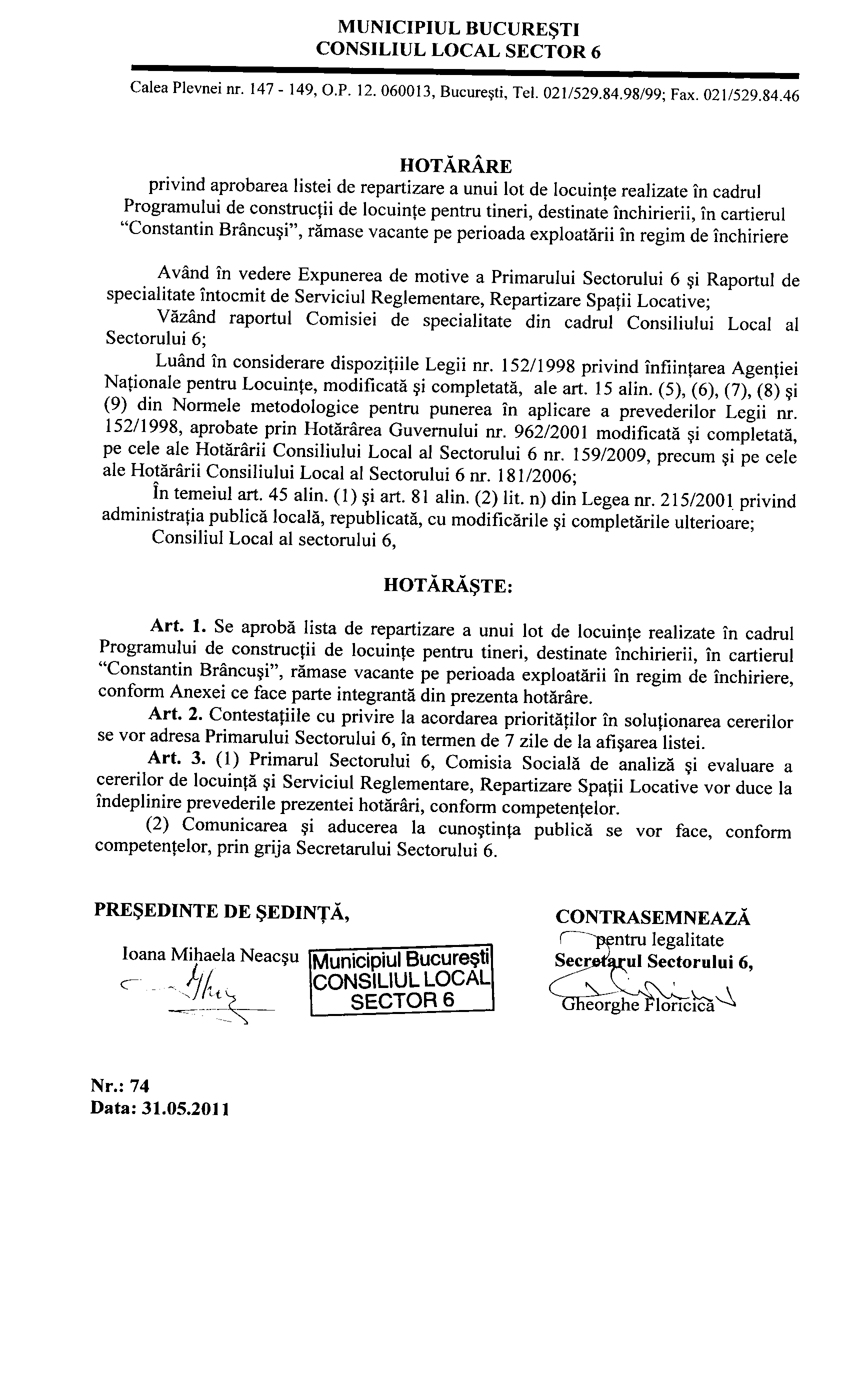 Hotărâre privind aprobarea listei de repartizare a unui lot de locuinţe realizate în cadrul Programului de construcţii de locuinţe pentru tineri, destinate închirierii, în cartierul "Constantin Brâncuşi", rămase vacante pe perioada exploatării în regim de închiriere