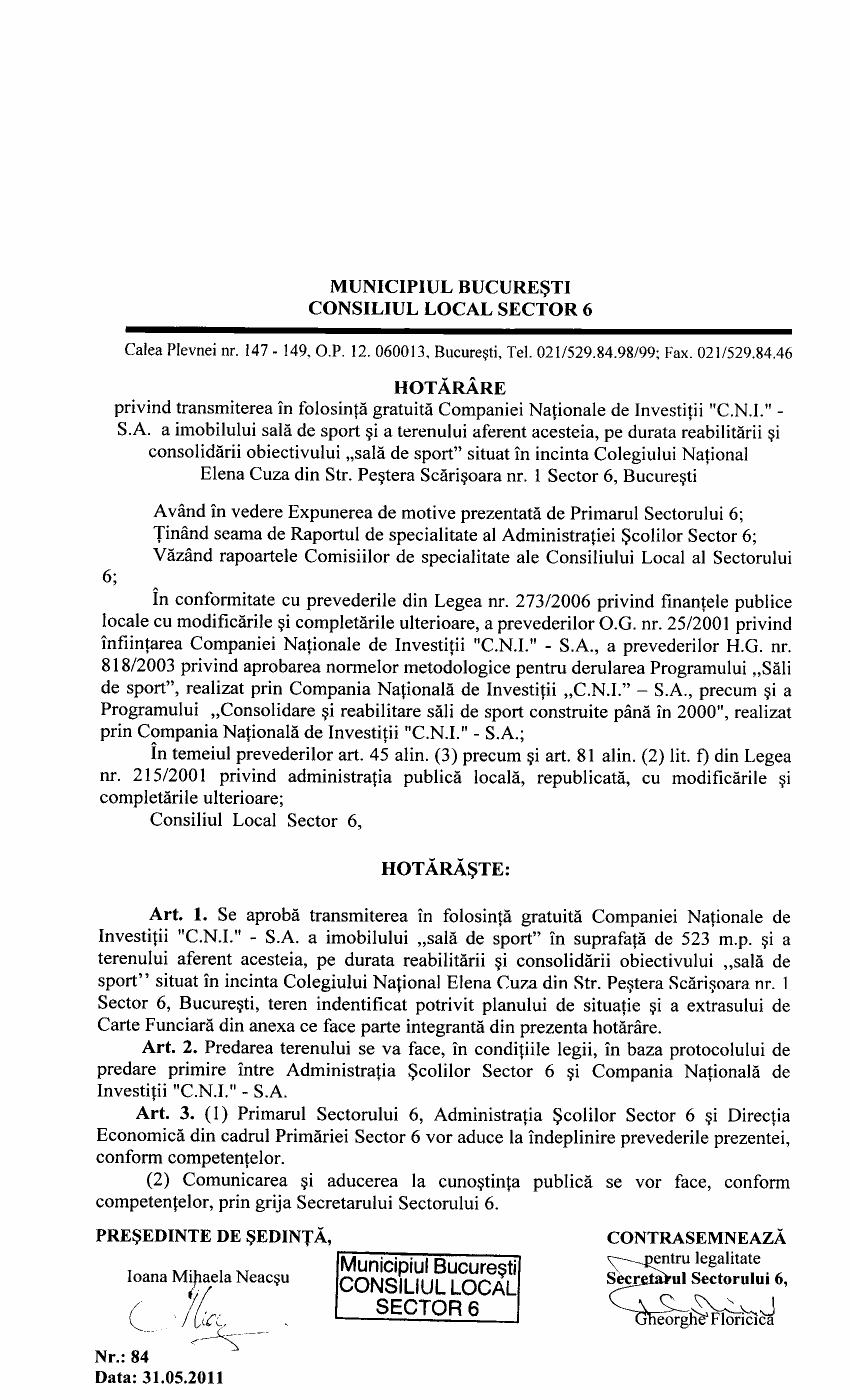 Hotărâre privind transmiterea în folosinţă gratuită Companiei Naţionale de Investiţii "C.N.I." – S.A. a imobilului sală de sport şi a terenului aferent acesteia, pe durata reabilitării şi consolidării obiectivului "sală de sport" situat în incinta Colegiului Naţional Elena Cuza din str. Peştera Scărişoara nr.1, Sector 6, Bucureşti
