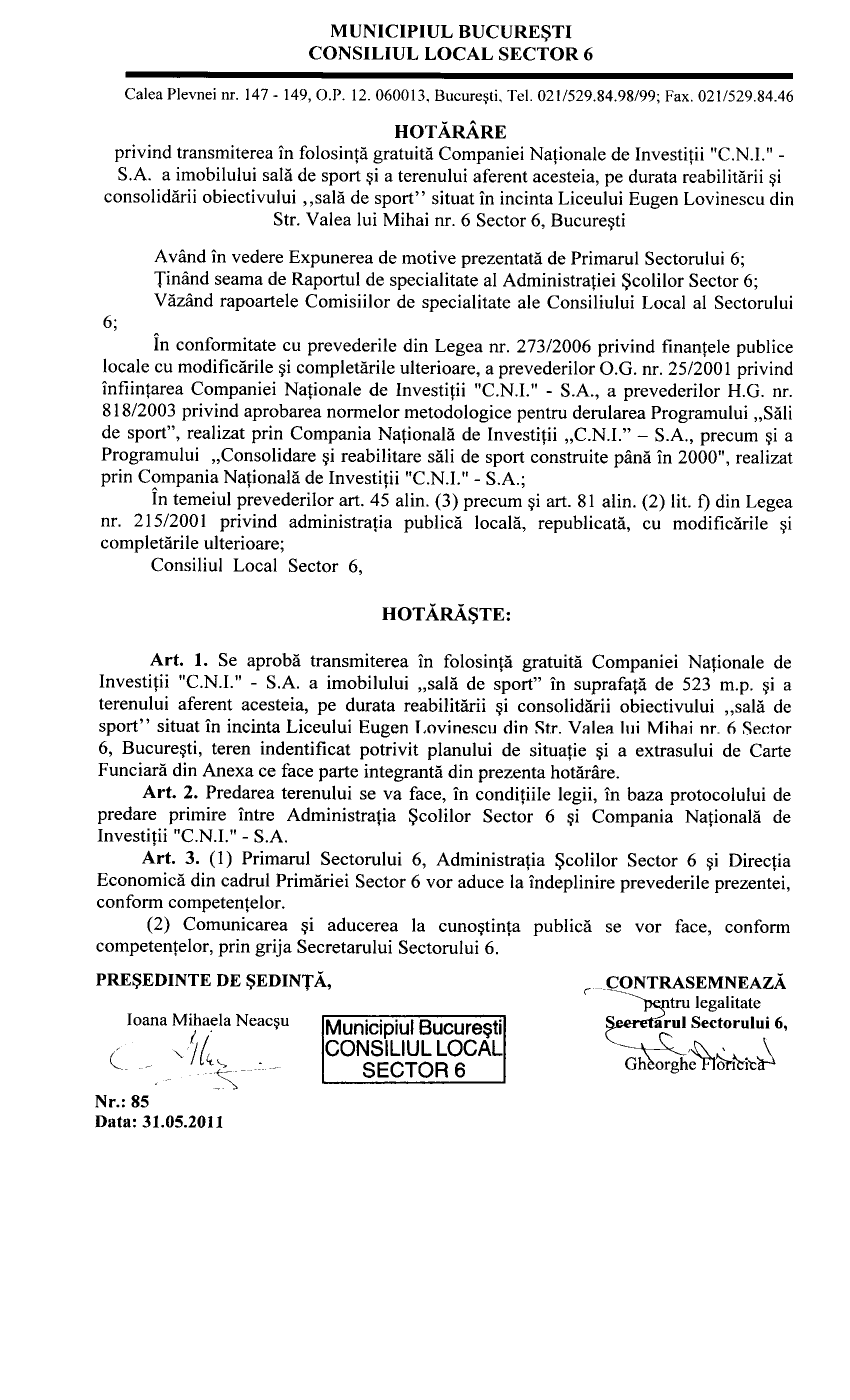 Hotărâre privind transmiterea în folosinţă gratuită Companiei Naţionale de Investiţii "C.N.I." – S.A. a imobilului sală de sport şi a terenului aferent acesteia, pe durata reabilitării şi consolidării obiectivului "sală de sport" situat în incinta Liceului Eugen Lovinescu din str. Valea lui Mihai nr.6, Sector 6, Bucureşti