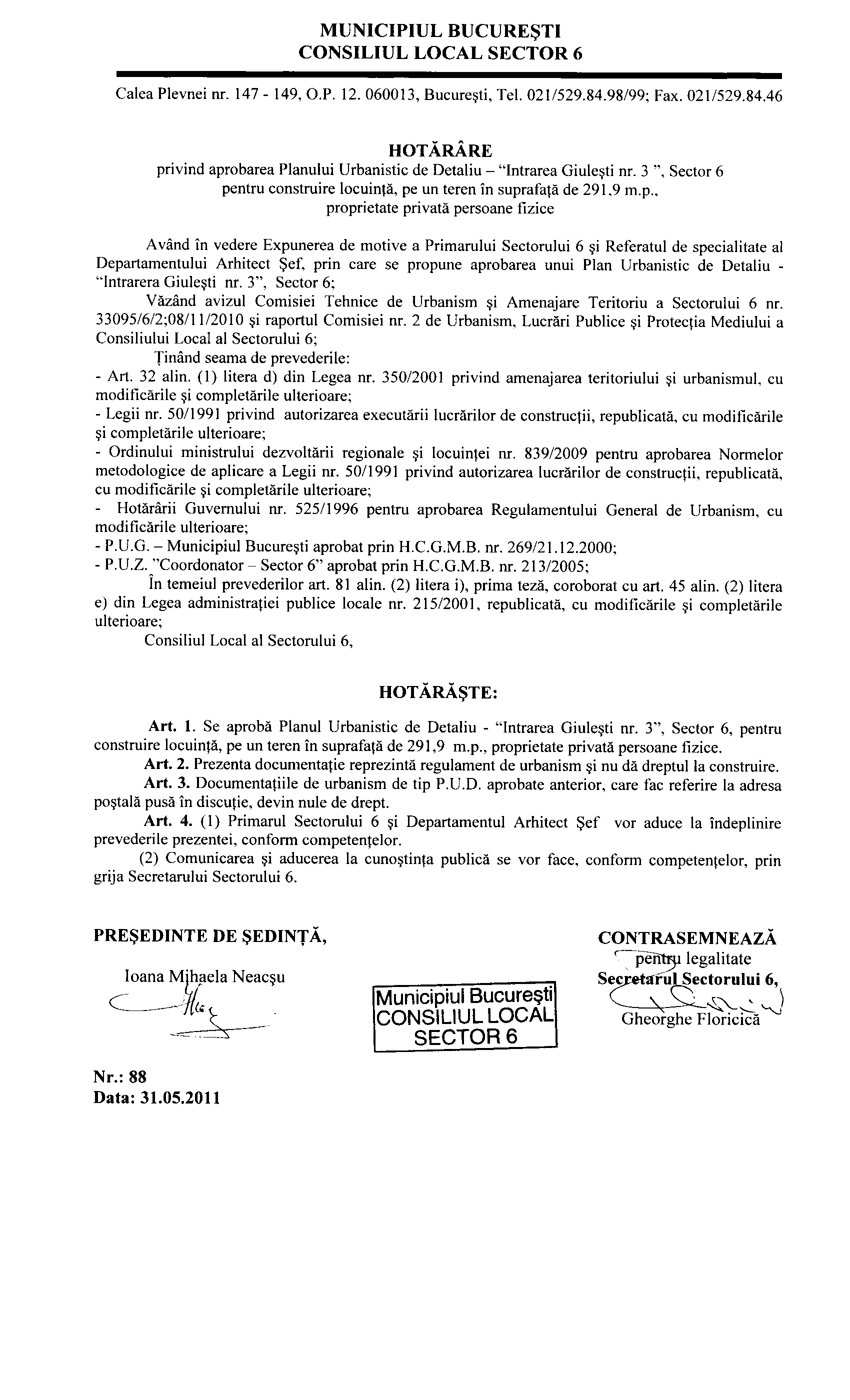 Hotărâre privind aprobarea Planului Urbanistic de Detaliu (PUD) – "Intrarea Giuleşti nr. 3", Sector 6 pentru construire locuinţă, pe un teren în suprafaţă de 291,9 m.p., proprietate privată persoane fizice