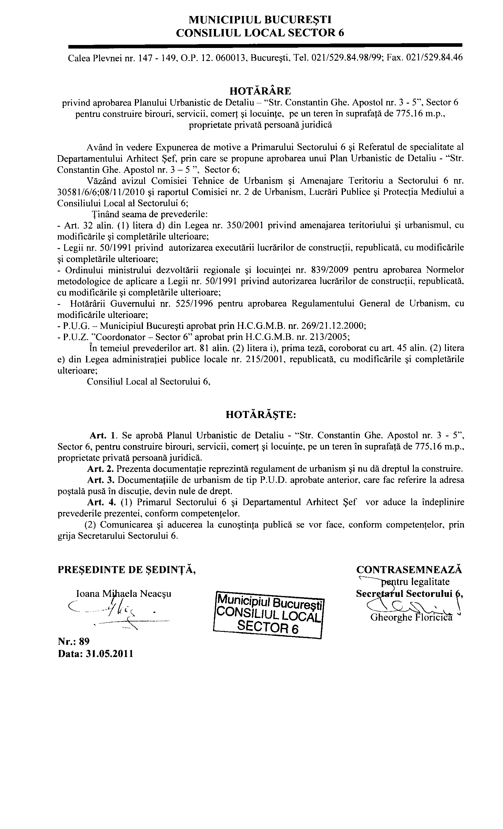 Hotărâre privind aprobarea Planului Urbanistic de Detaliu (PUD) – "Str. Constantin Ghe. Apostol nr. 3-5", Sector 6 pentru construire birouri, servicii, comerţ şi locuinţe, pe un teren în suprafaţă de 775,16 m.p., proprietate privată persoană juridică