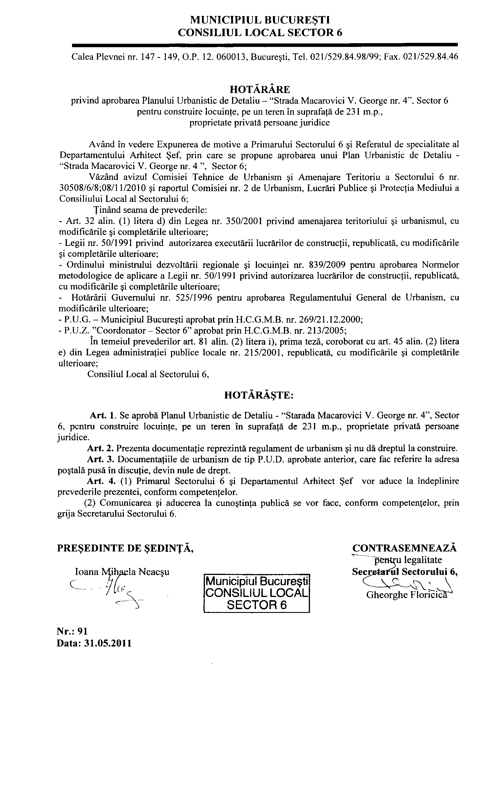 Hotărâre privind aprobarea Planului Urbanistic de Detaliu (PUD) – "Strada Macarovici V. George nr. 4", Sector 6 pentru construire locuinţe, pe un teren în suprafaţă de 231 m.p., proprietate privată persoane juridice