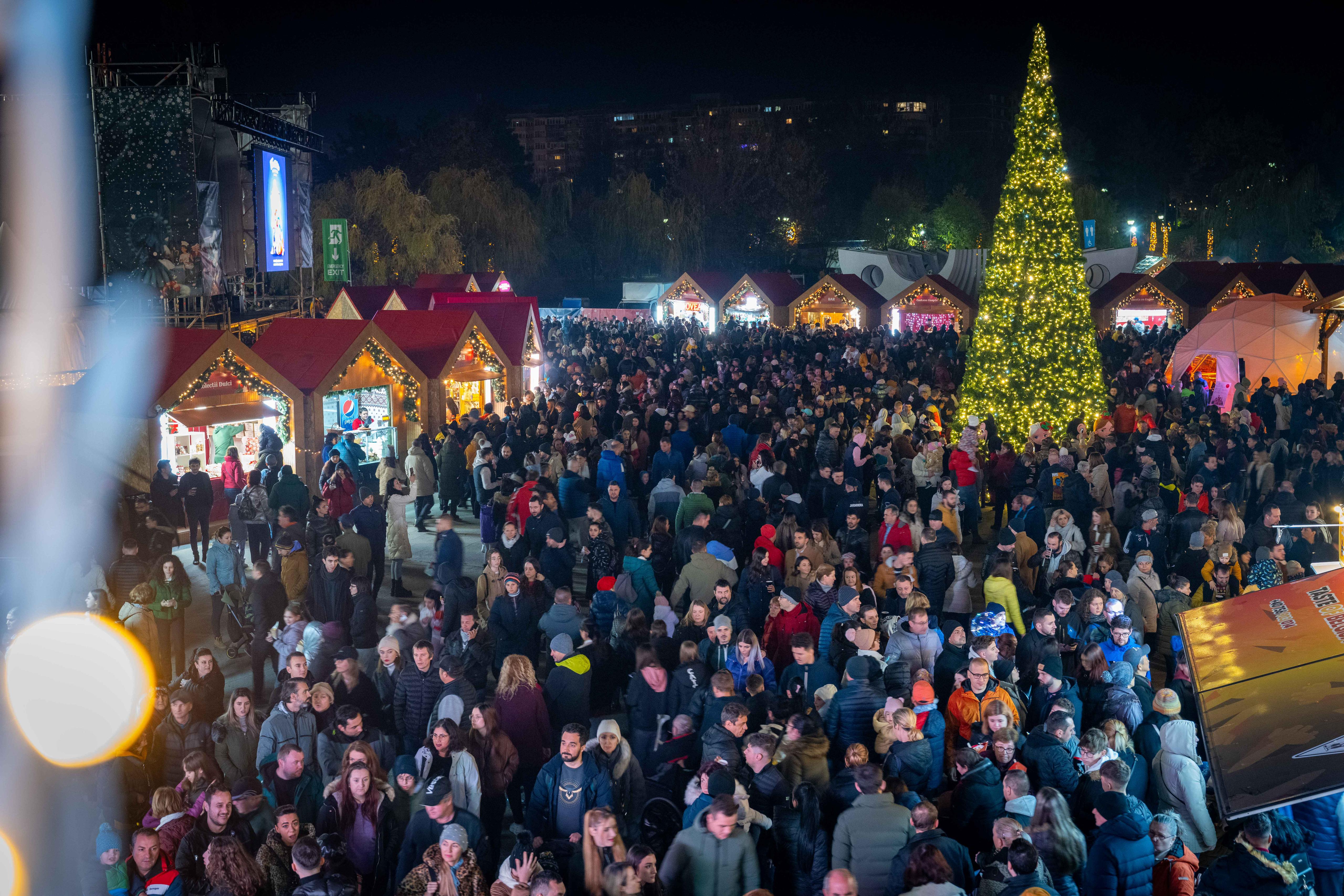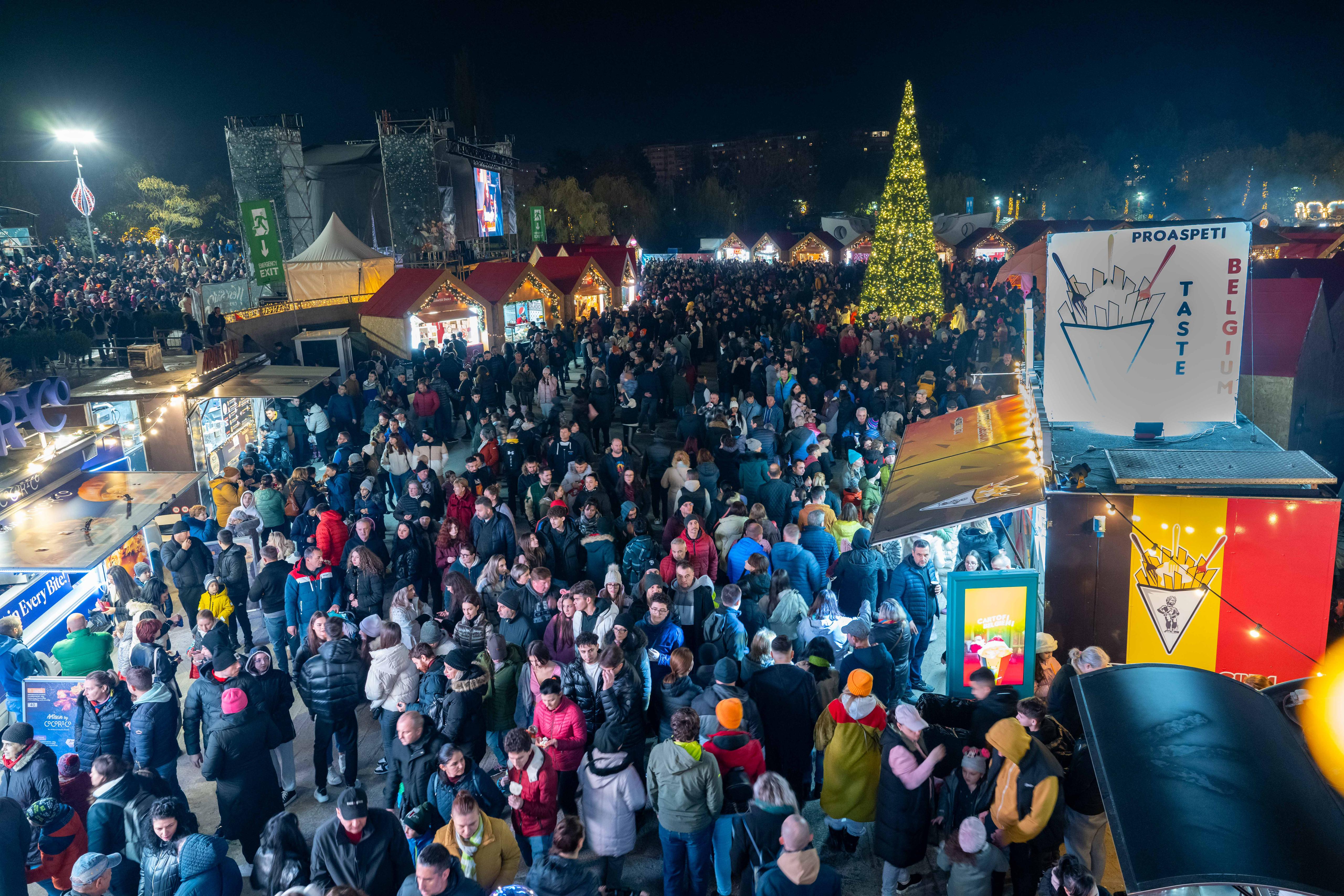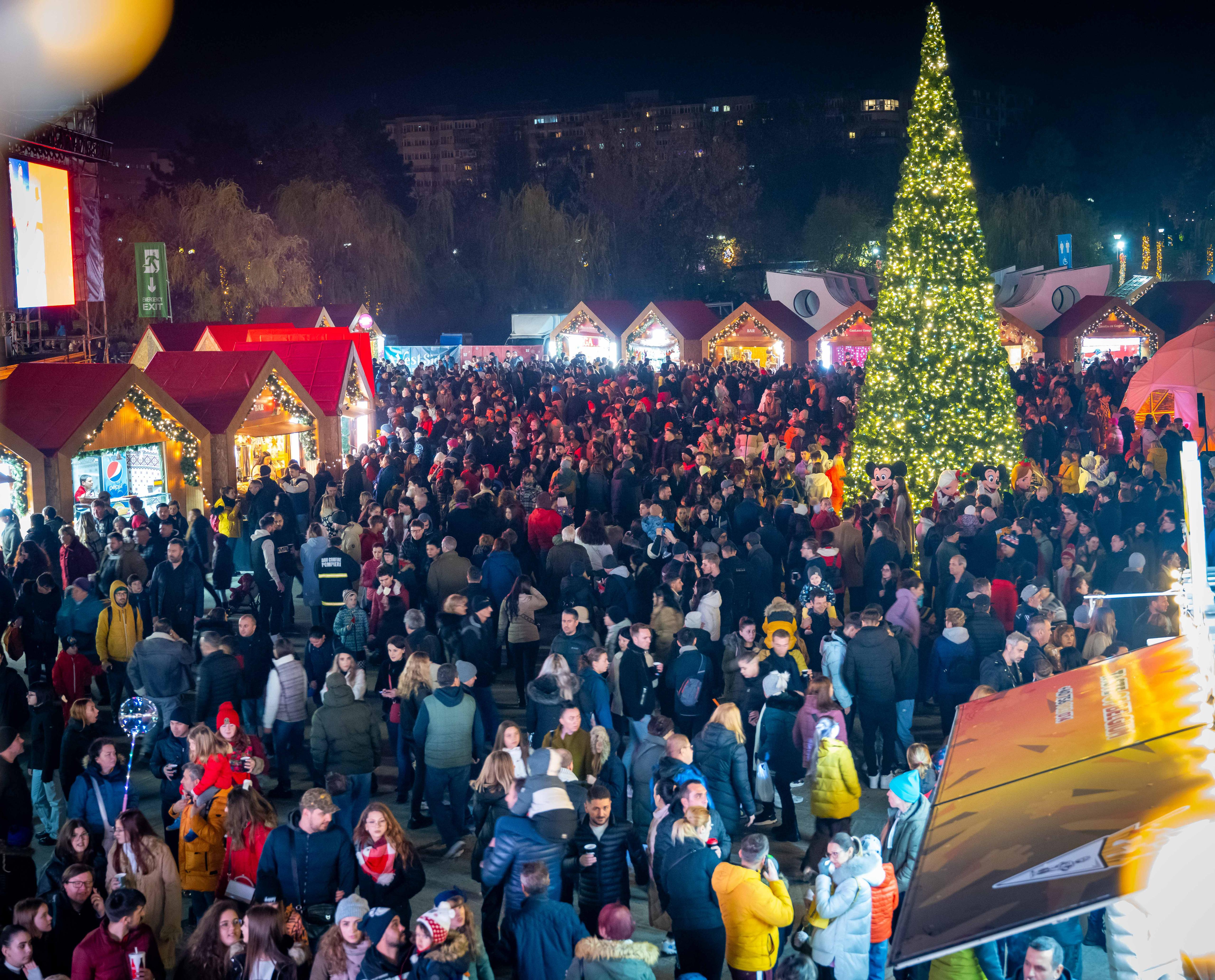 Luminițele au fost aprinse de un grup format din copii cărora li s-a alăturat și un veteran în vârstă de 100 de ani. Forfotă mare a fost și la cele 65 de căsuțe cu bunătăți tradiționale sau din toate bucătăriile lumii, care i-au îmbiat pe cei prezenți cu vin fiert, cârnați, cartofi prăjiți sau turtă dulce. Seara s-a încheiat cu un concert impresionant, susținut de Fuego.