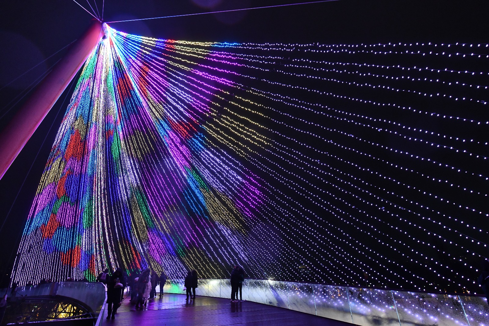 Are o lungime de peste 100 de metri, suspendată pe podul hobanat, emblema parcului. Perdeaua de lumini e compusă din 200.000 de leduri interactive, care formează jocuri de lumini, în 23 de moduri. E un adevărat spectacol.